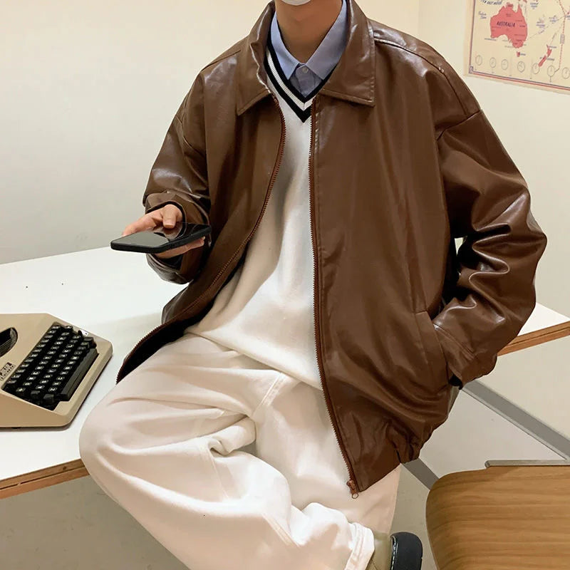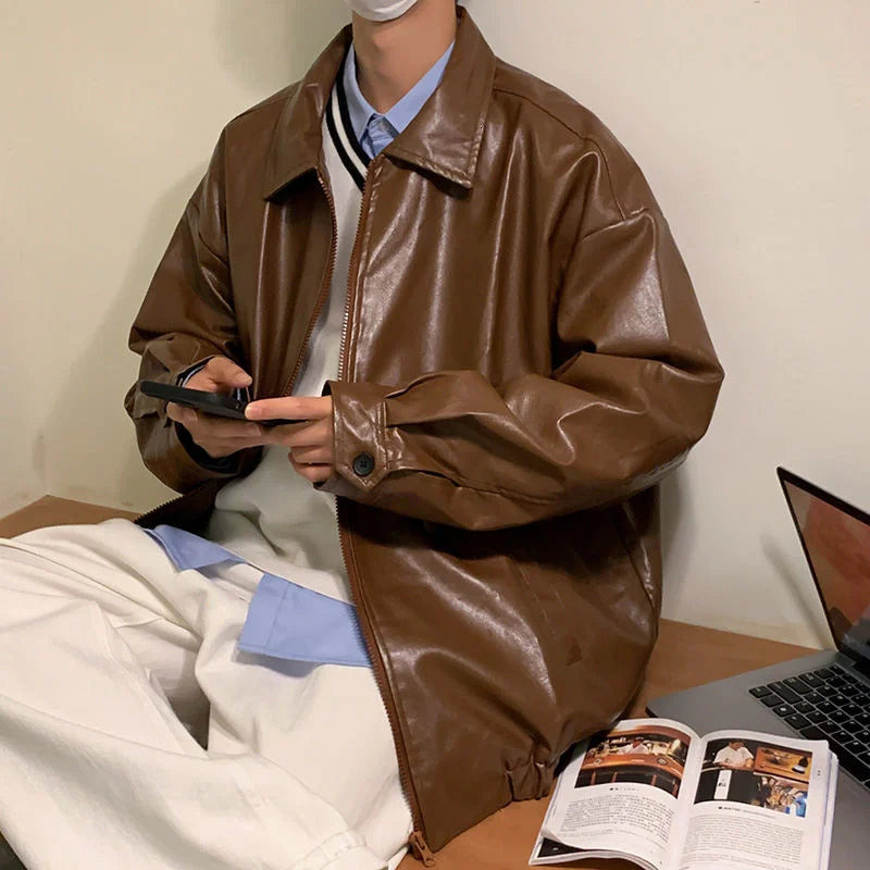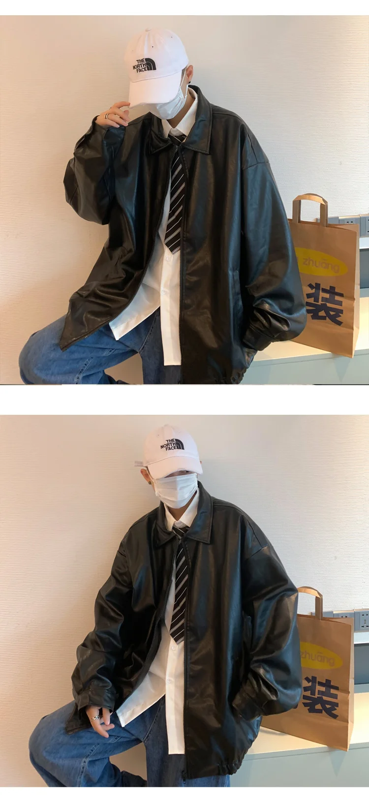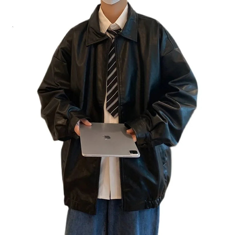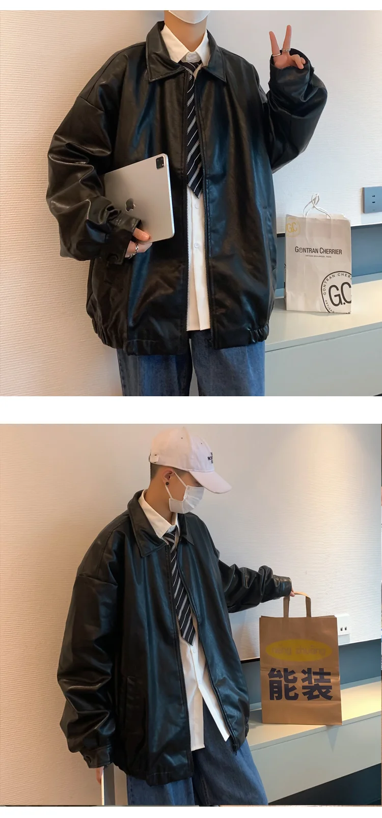 saferido Men's Motorcycle PU Leather Jackets Loose Casual Baseball Lapel Collar Coats Brown Color Oversized Black Outerwear M-2XL