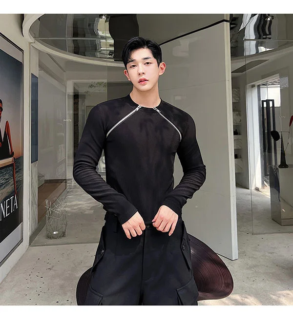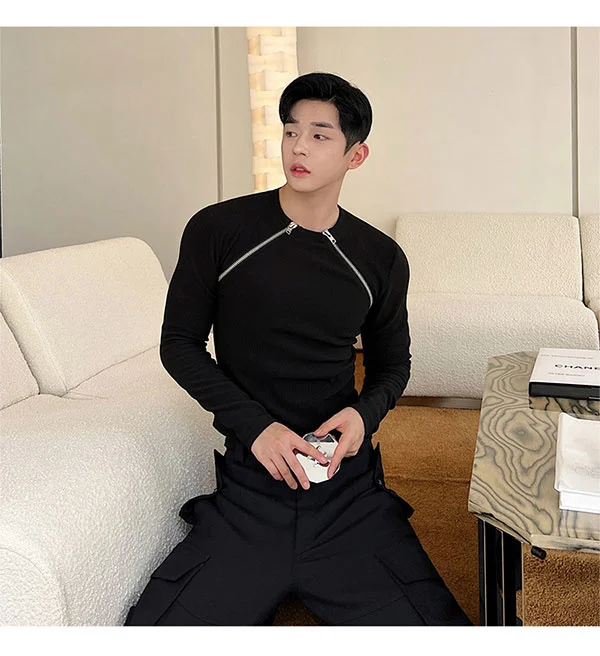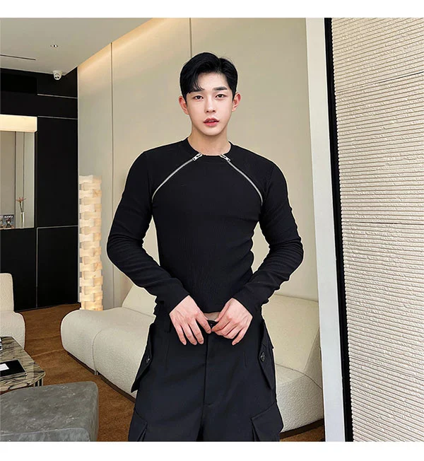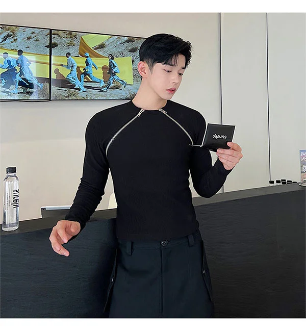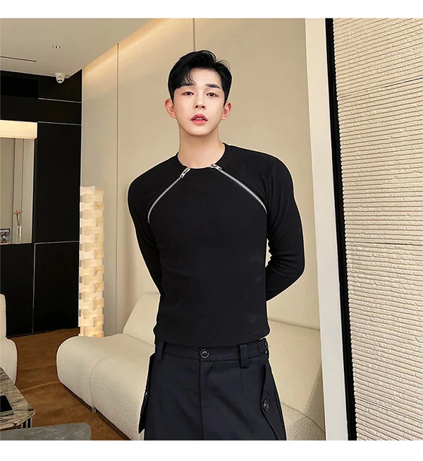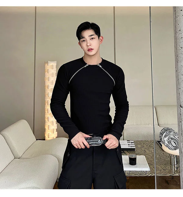 saferido Men's Slim Long Sleeve T-shirts 2024 Autumn New Niche Design Dark Zipper Split Versatile Tops Korean Style Clothing