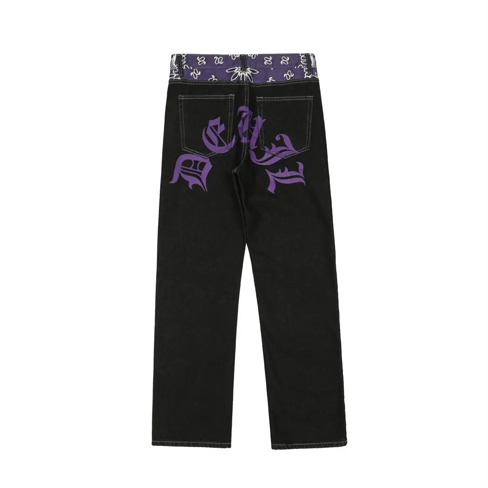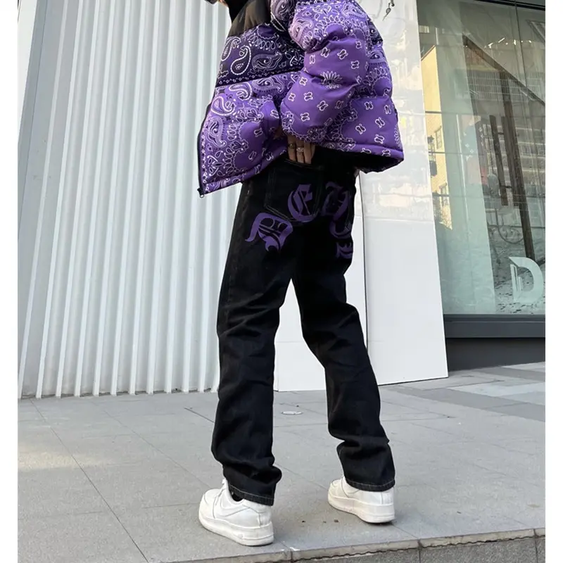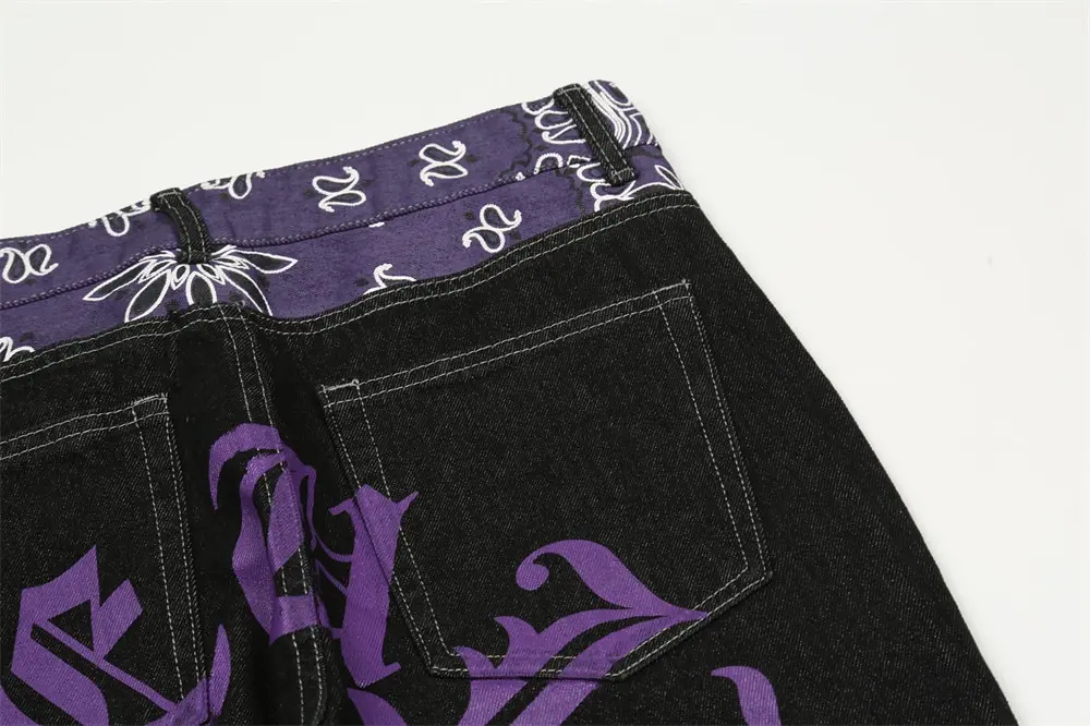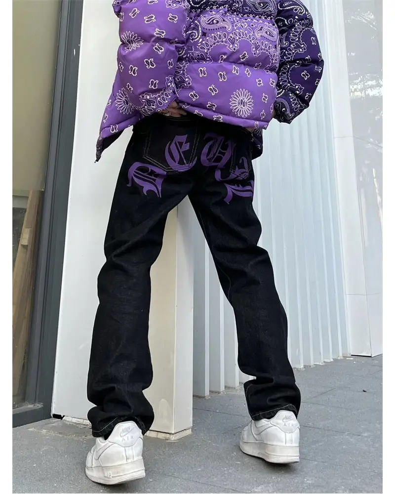 saferido Men's Y2k Jeans Cashew Flowers Purple Streetwear Casual Pants Punk Hip Hop Letter Print Baggy Harajuku Straight Denim Trousers