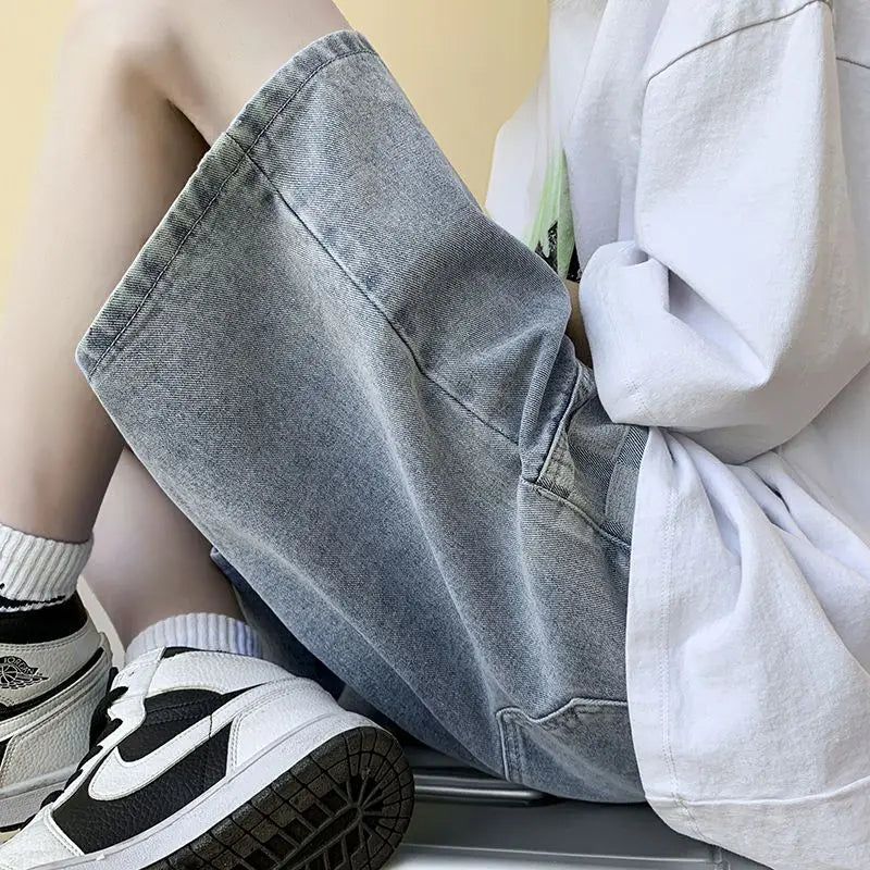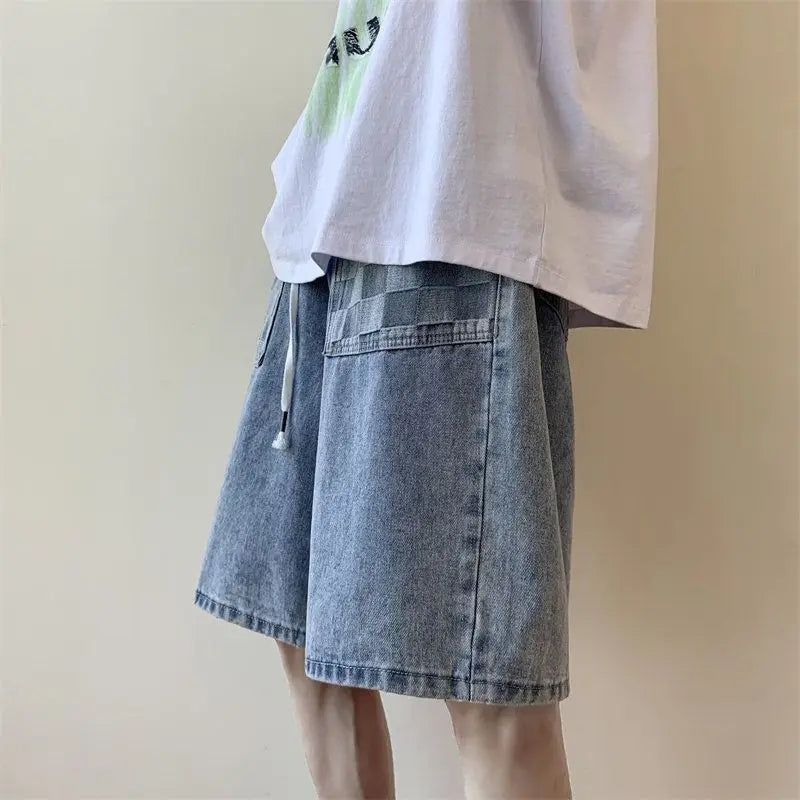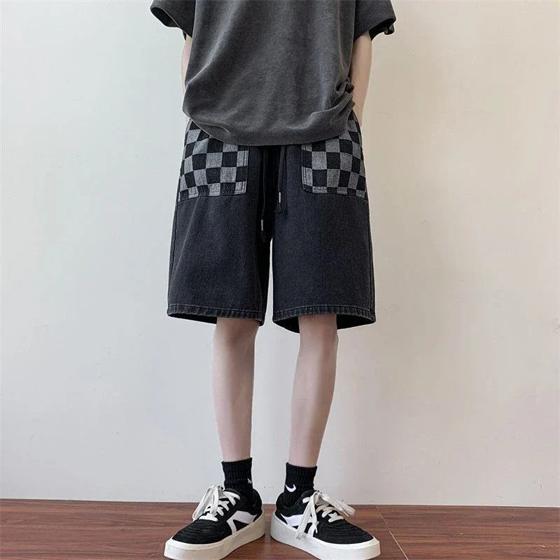 saferido New Summer Men's Stitching Plaid Short Jeans Korean Fashion Streetwear Blue Baggy Denim Shorts Wide Leg Large Pocket Shorts