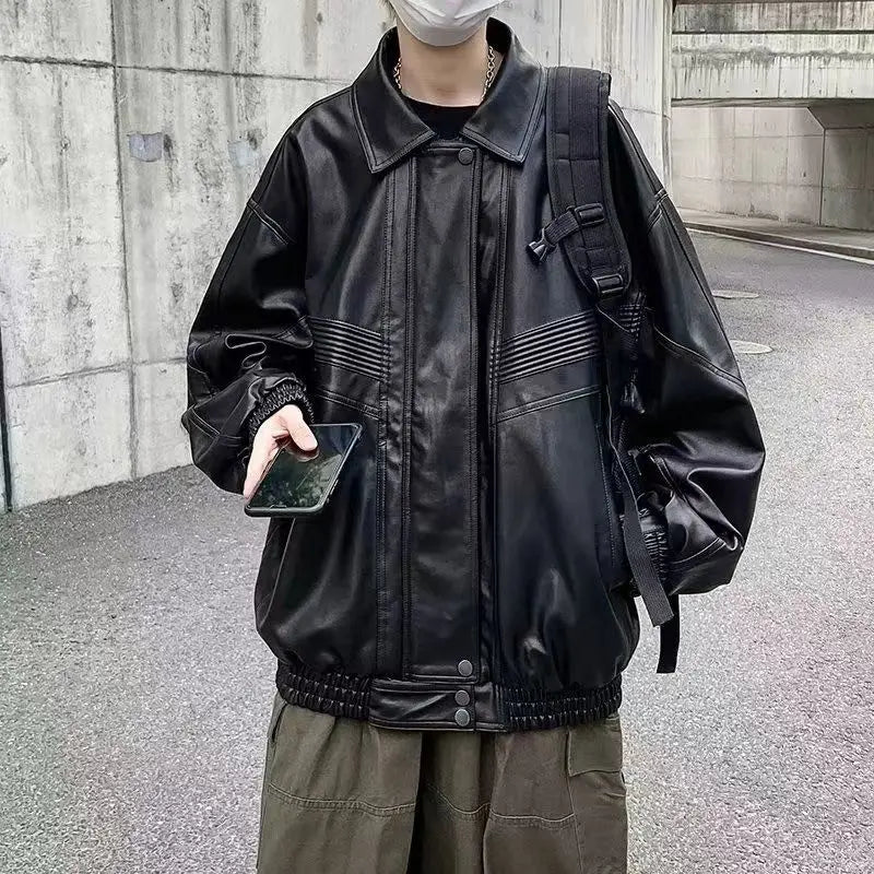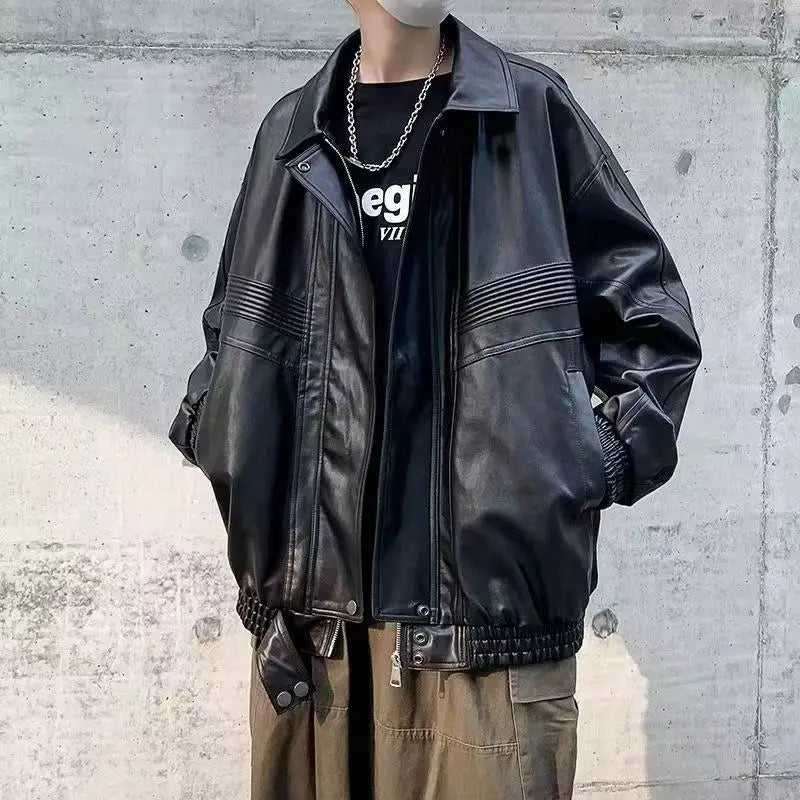 Oversized Autumn Men's Leather Jackets Black VIntage PU Biker Coat Faux Leather Bomber Jacket Big Pockets Windbreaker Overcoat