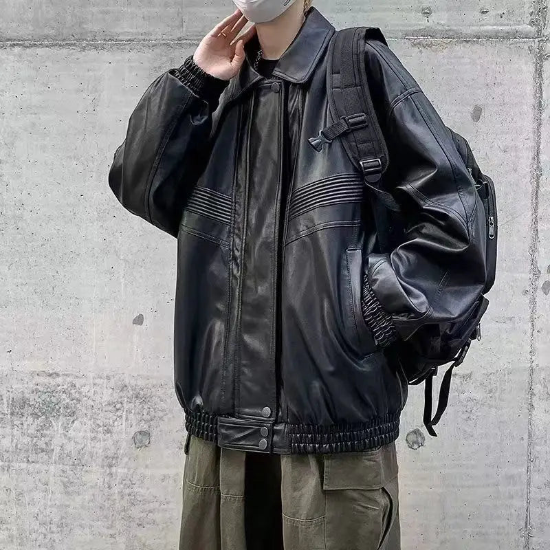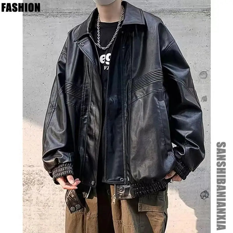 saferido Oversized VIntage Men's Leather Jackets PU Biker Coat Autumn Faux Leather Bomber Jacket 90s Big Pockets Windbreaker Overcoat