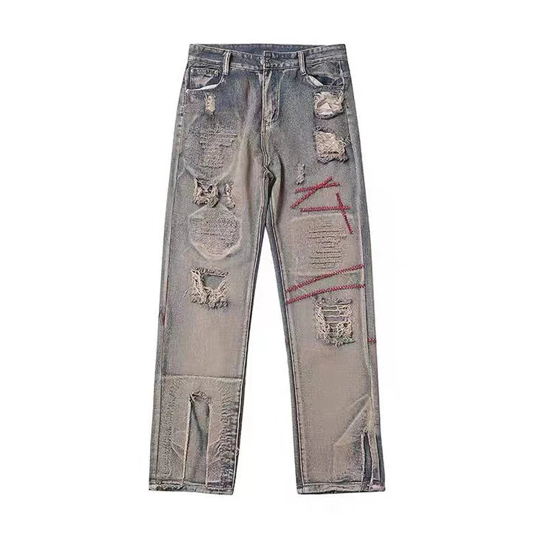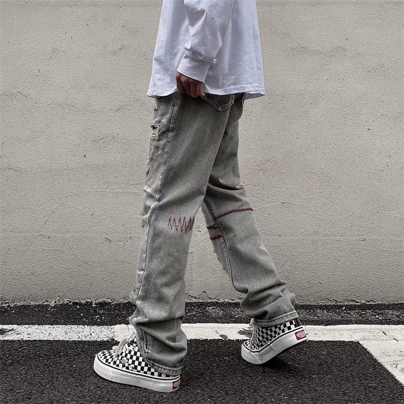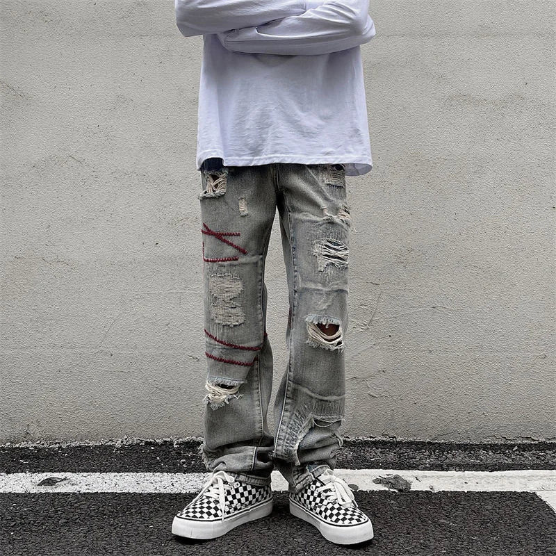 saferido Ripped Jeans Men's Hip-hop Street Old Loose Stitching Straight Beggar Pants Retro Casual Trend Spring And Summer Denim Trousers