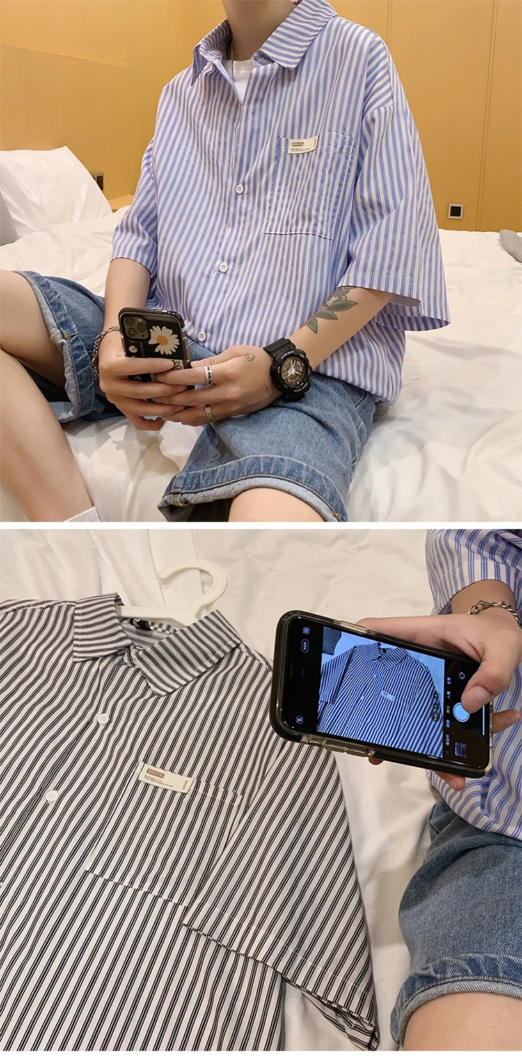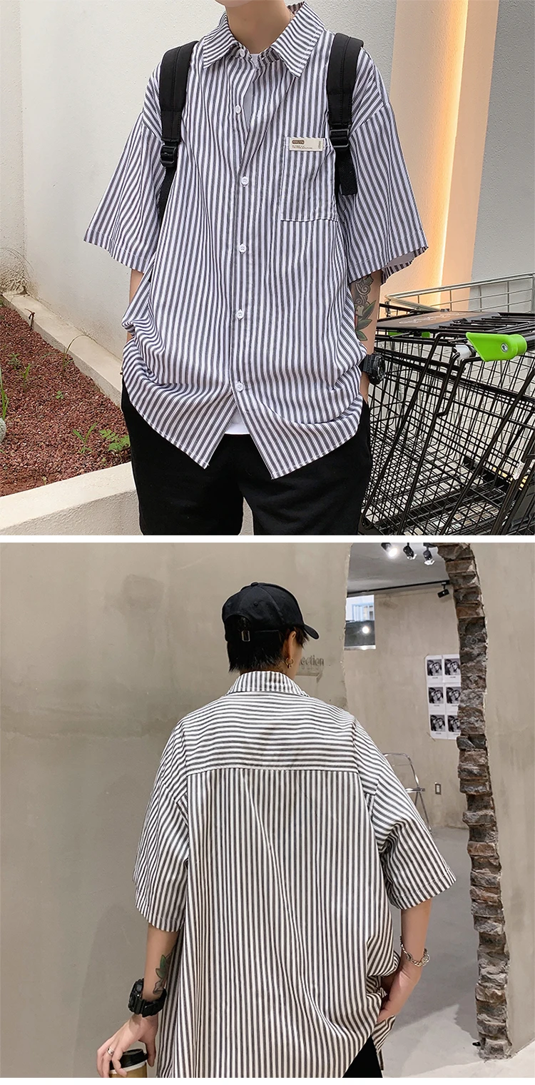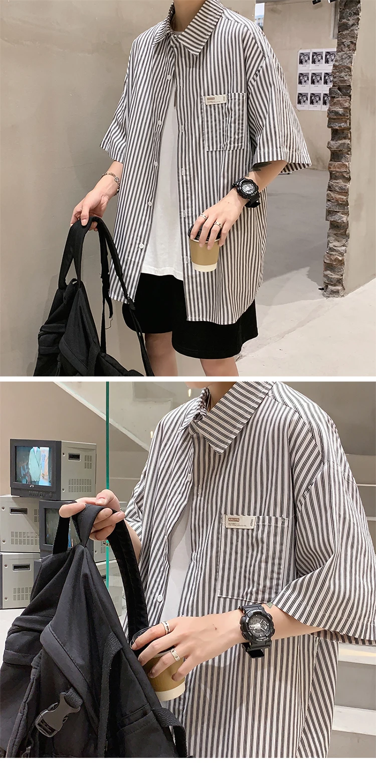 saferido Rocking k Summer Stripe Shirt Men's Korean fashion ins short sleeve shirt men's BF Harajuku handsome top loose casual coat