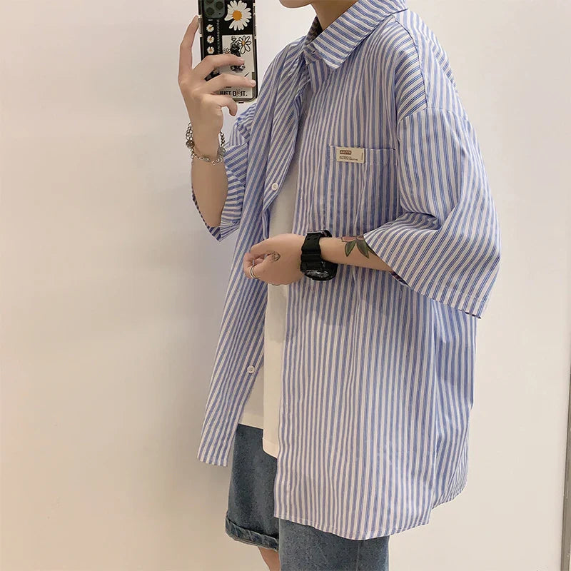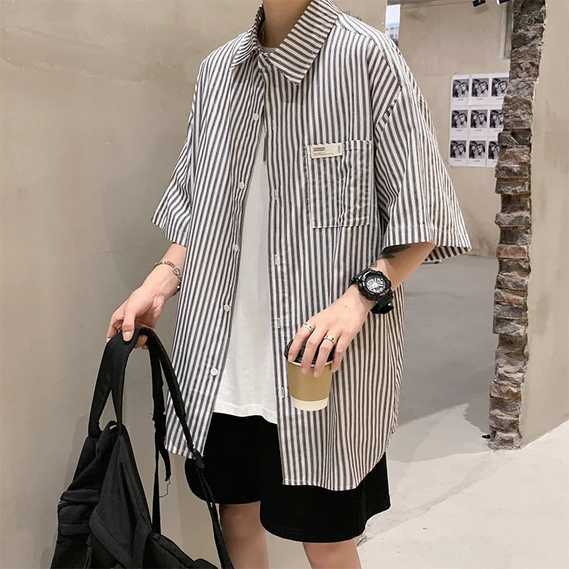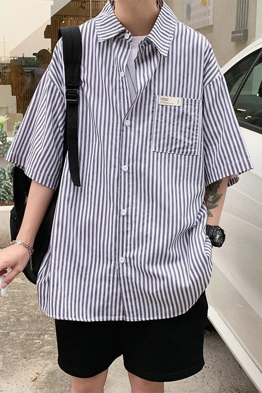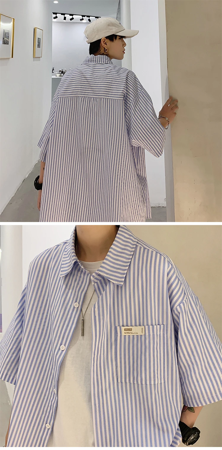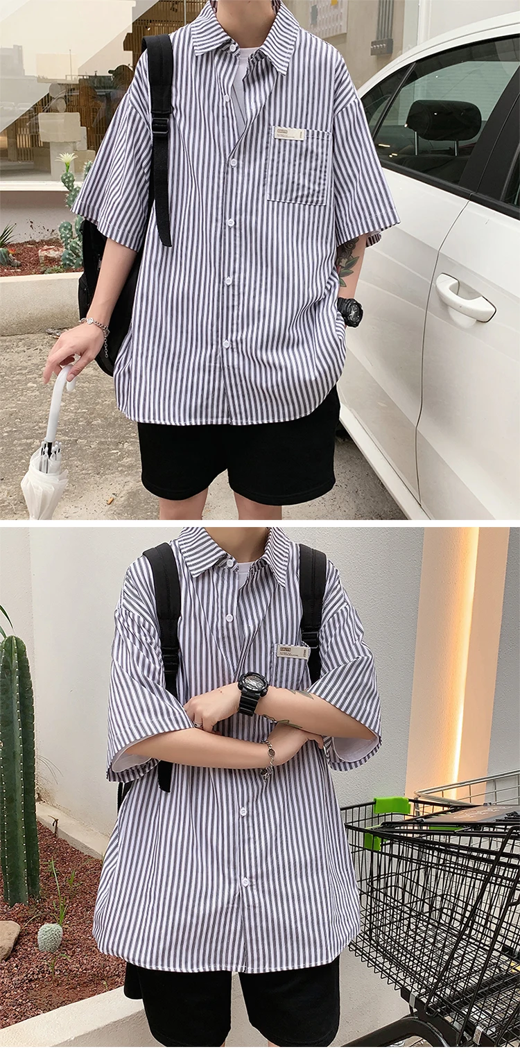 saferido Rocking k Summer Stripe Shirt Men's Korean fashion ins short sleeve shirt men's BF Harajuku handsome top loose casual coat