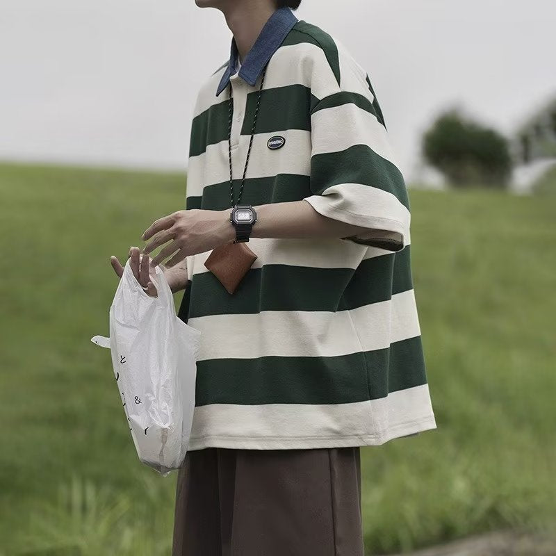 saferido -shop masc outfits American Retro Design Striped Top Men's and Women's Summer Loose All-Match College Style Couple Polo Shirt Short Sleeve Fashion