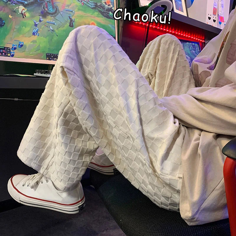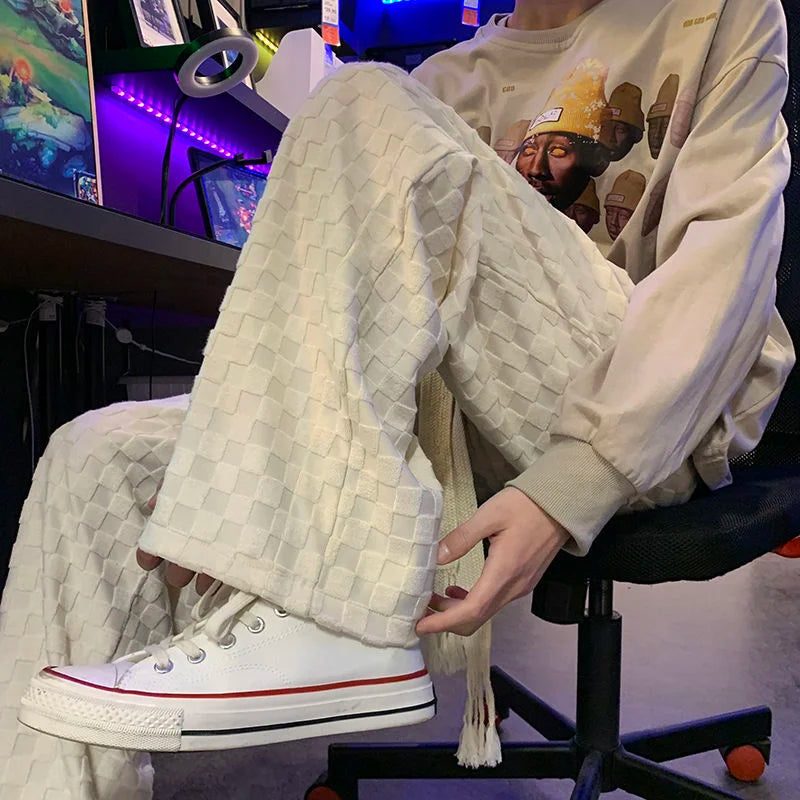 saferido Straight Wide Leg Knitted Sweatpants Men's Spring Autumn Solid Color Plaid Casual Pants Sports Trend Classic All-match Trousers