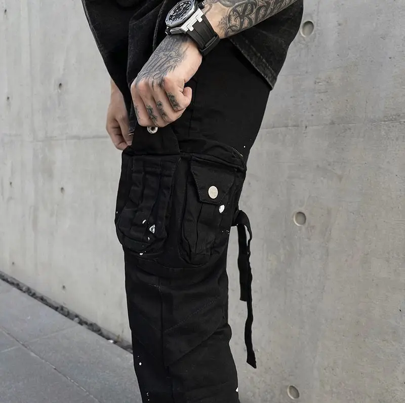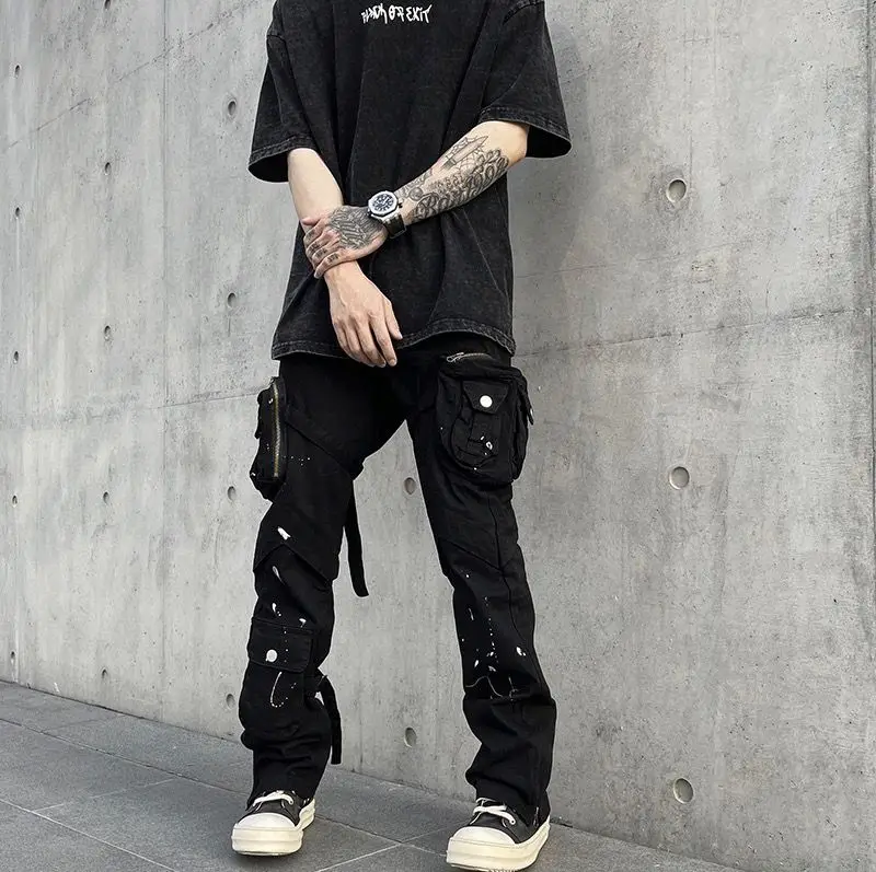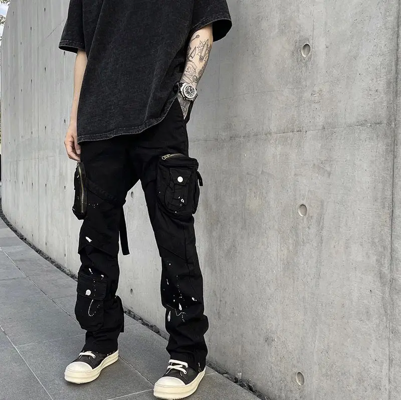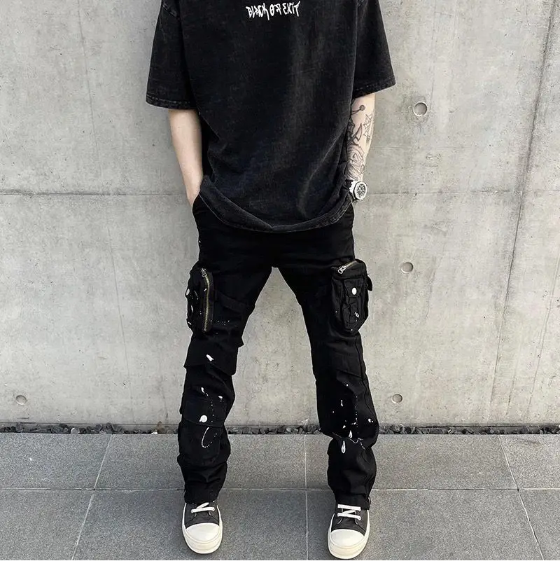 saferido Street Strap Speckled Ink Pocket Stereoscopic Cut Micro Horn Workwear Pants Hip Hop High Street Punk y2k streetwear Stacked Casual Pants