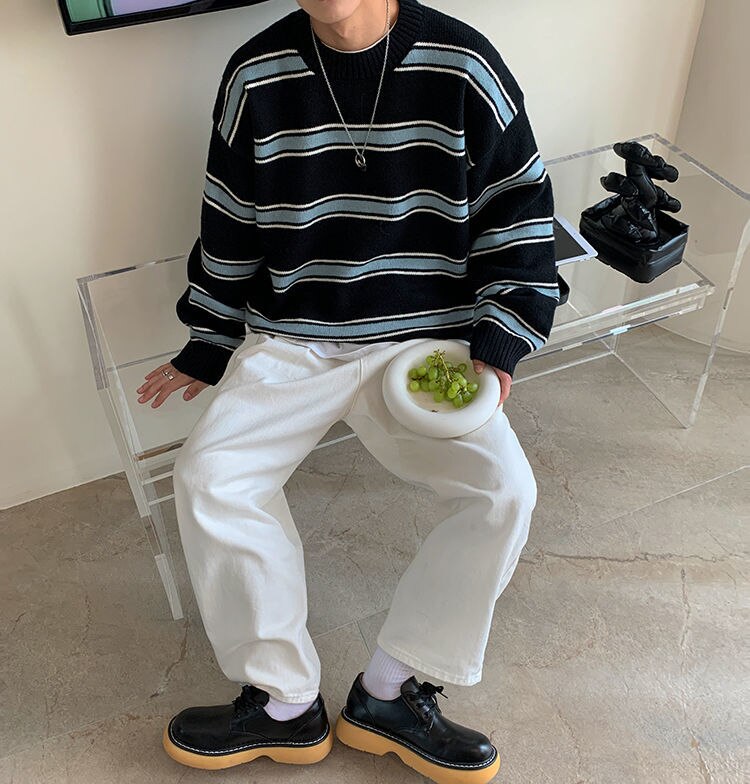 saferido Striped Sweater Men Round Neck Winter Pullover Sweater Korean Fashion Harajuku Loose Wild Long Sleeve Sweater Oversize