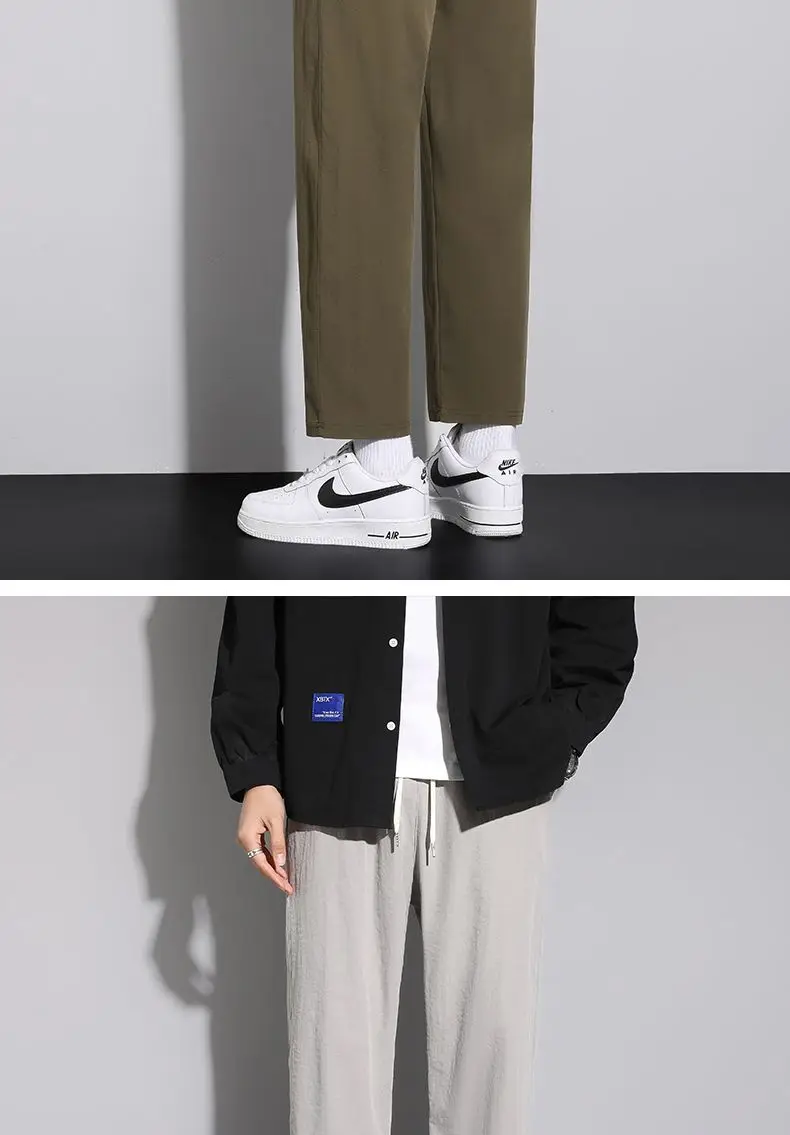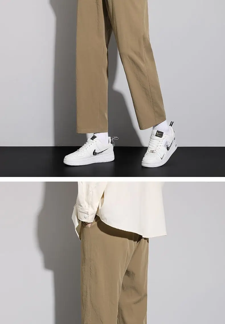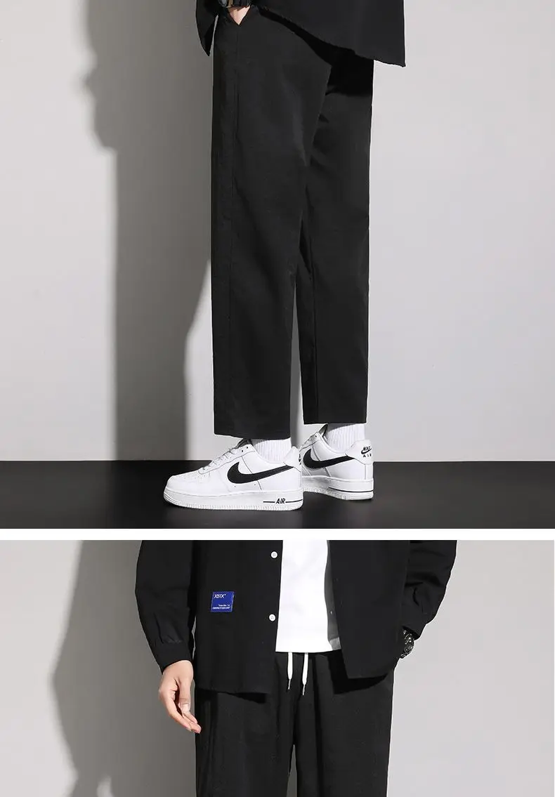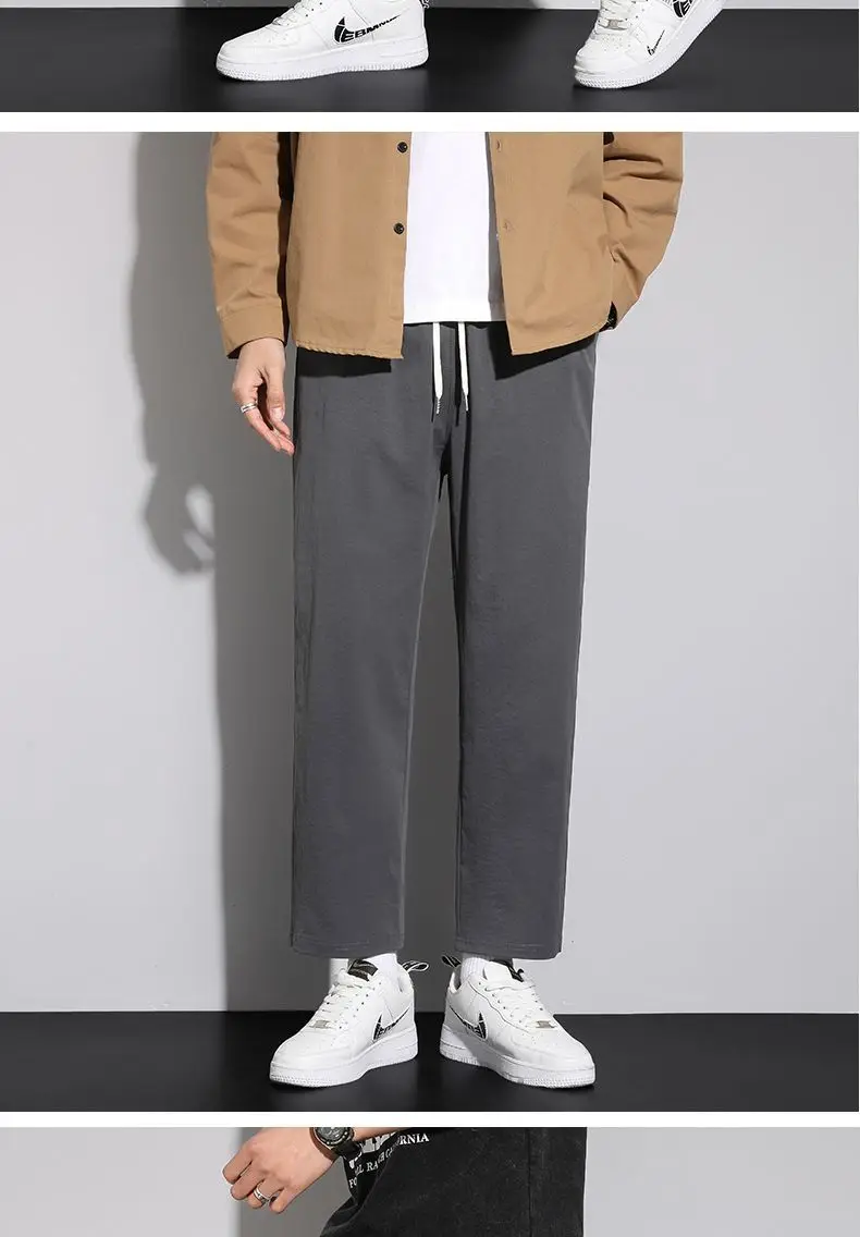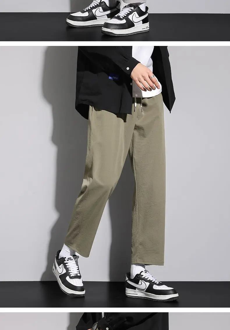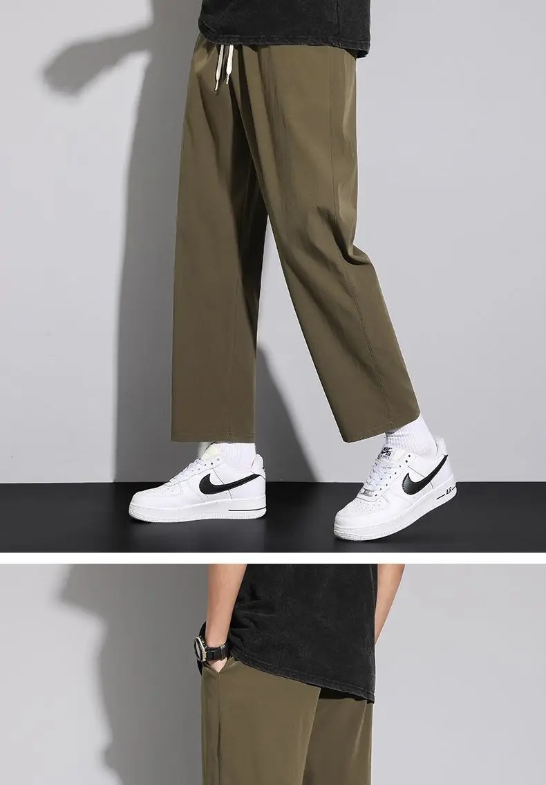 saferido Summer New Korean Trendy Loose Versatile Casual Straight Pants Men Solid Elastic Waist Drawstring Pocket Thin Wide Leg Trousers
