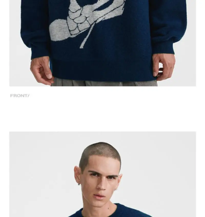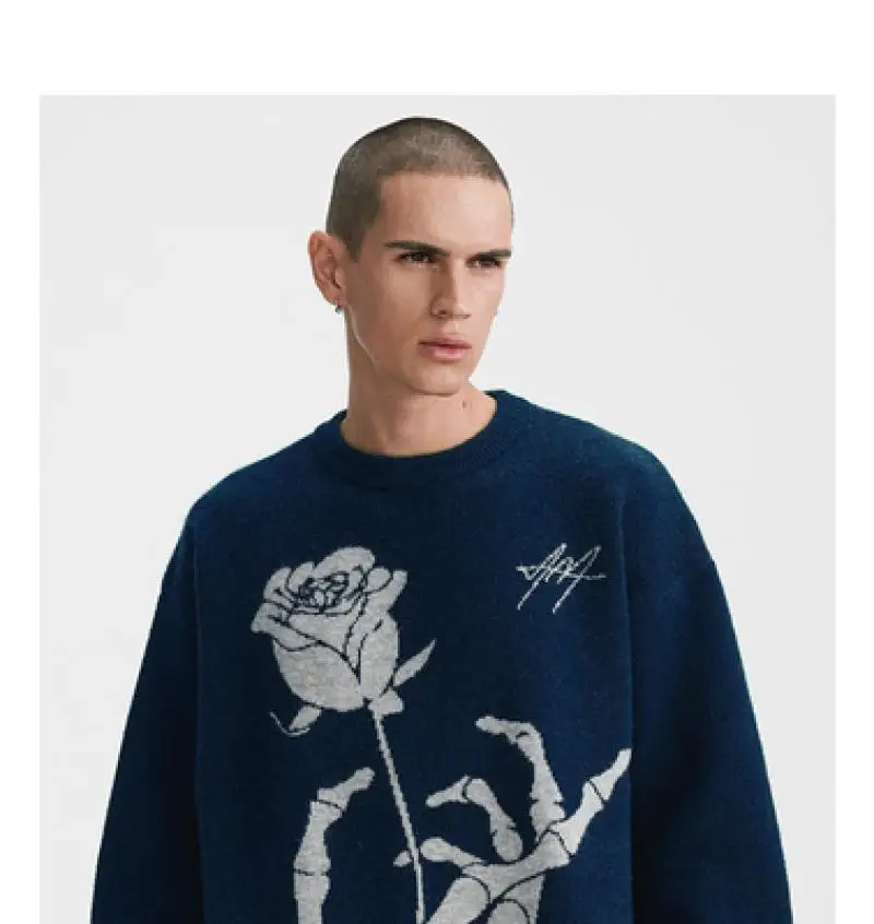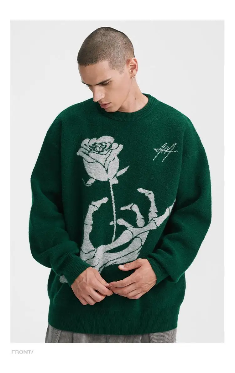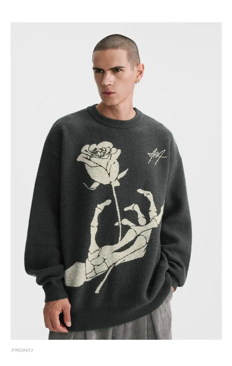 saferido Sweater Rose Skeleton Sweater Men's Autumn and Winter American Vintage Jacquard Loose and Lazy Couple Knitwear Men's and Women's