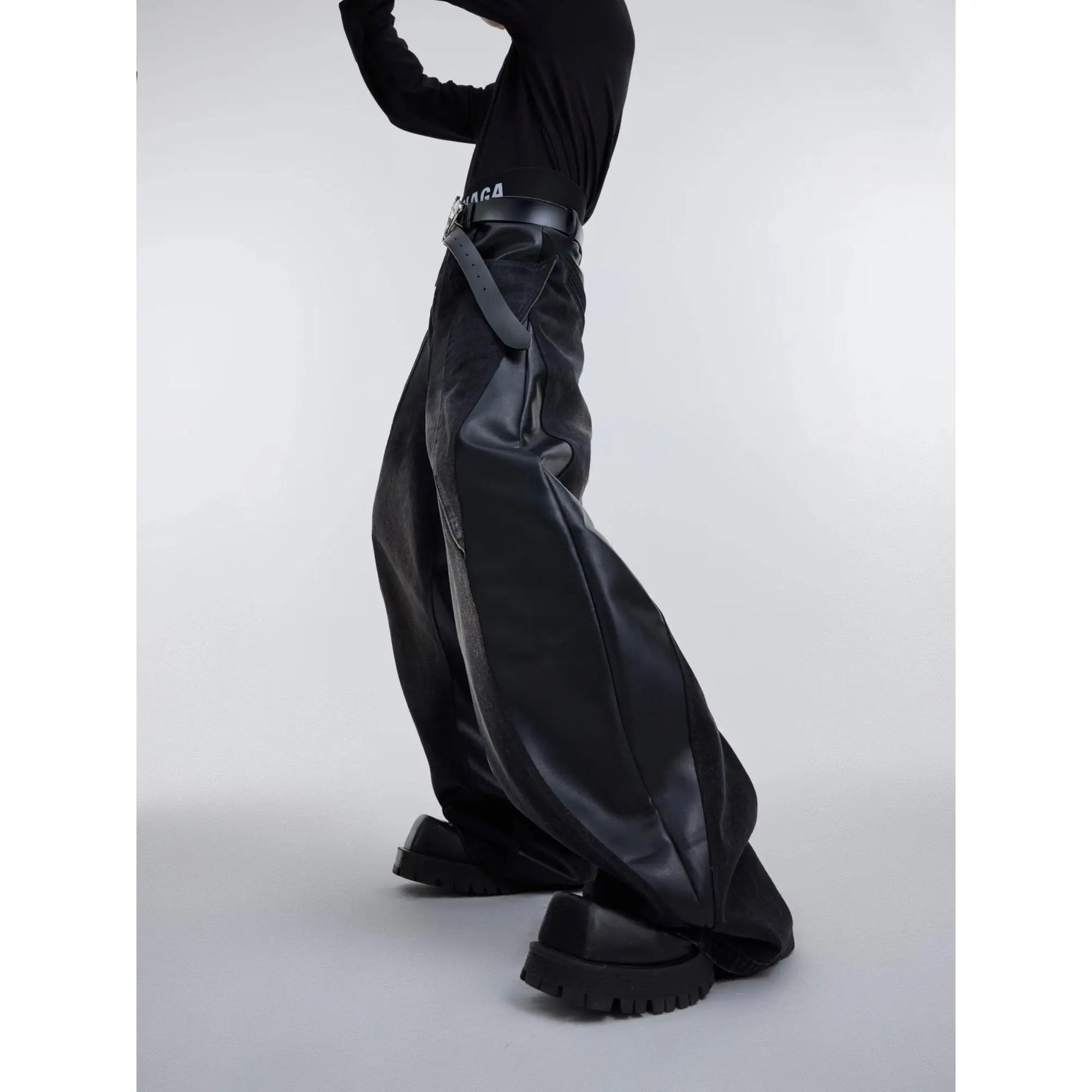 saferido Y2k Retro Washed Splicing Jeans for Men New Hip Hop Punk PU Leather Baggy Jeans Straight Casual Black Denim Trousers Streetwear