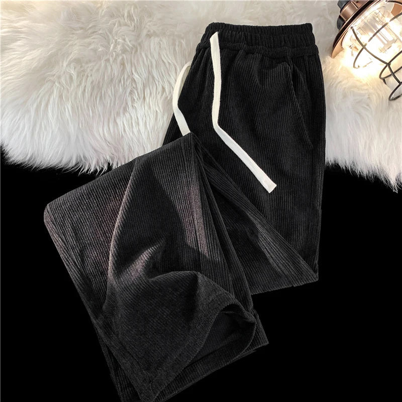 Spring Men's Corduroy Casual Pants Baggy Straight Black Elastic Waist Korean Fashion Streetwear Ankle Wide Leg Sweatpants