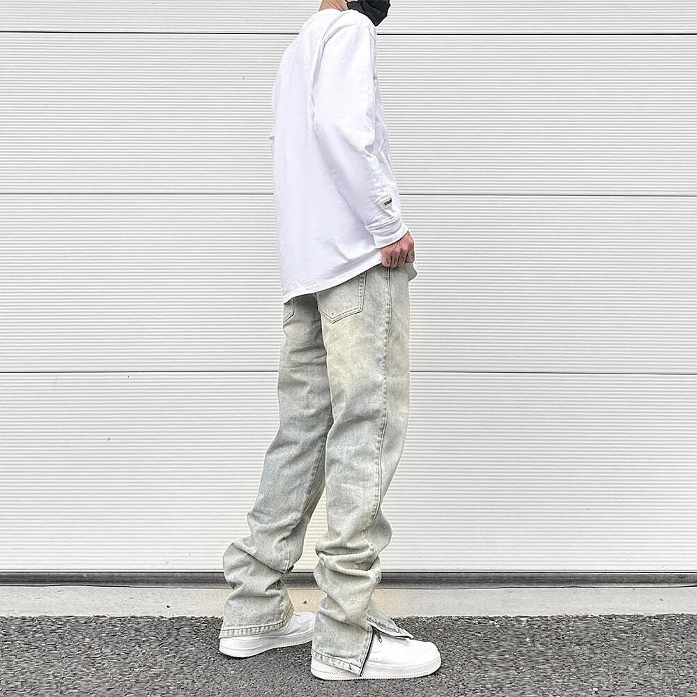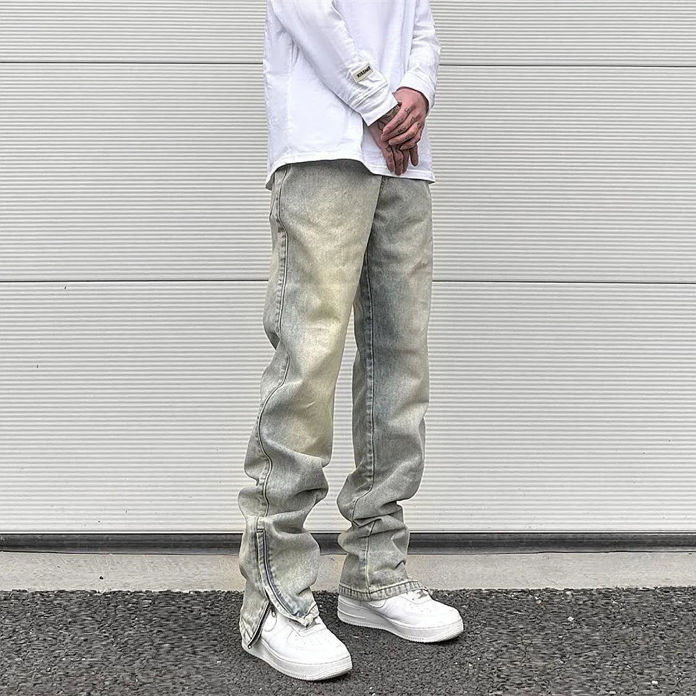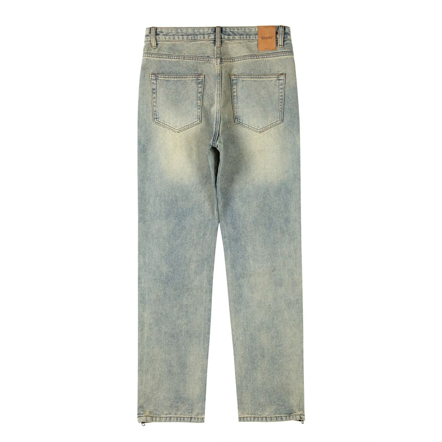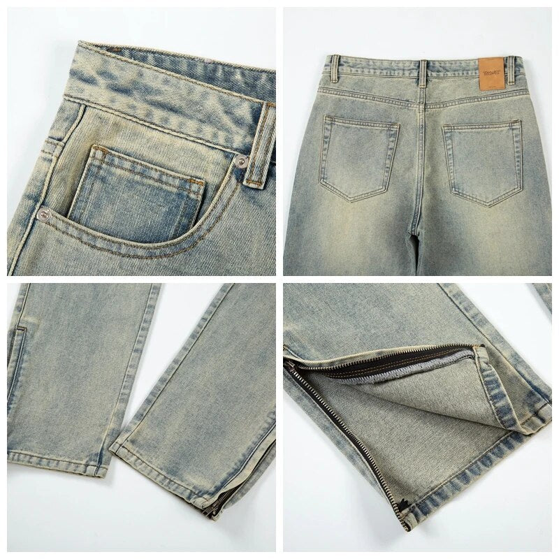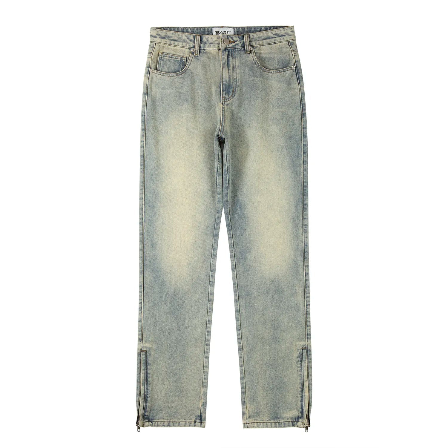 Streetwear Vibe Vintage Distressed Washed Trousers Jeans Yellow Mud Dyed Zipper Split Straight Jeans Men's and Women's Clothing