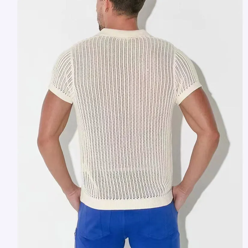 Summer Mens Hollow Out Knit Polo Shirts Sexy See Through Short Sleeve V-lapel Tops Fashion Mesh Loose Casual T-shirt Streetwear