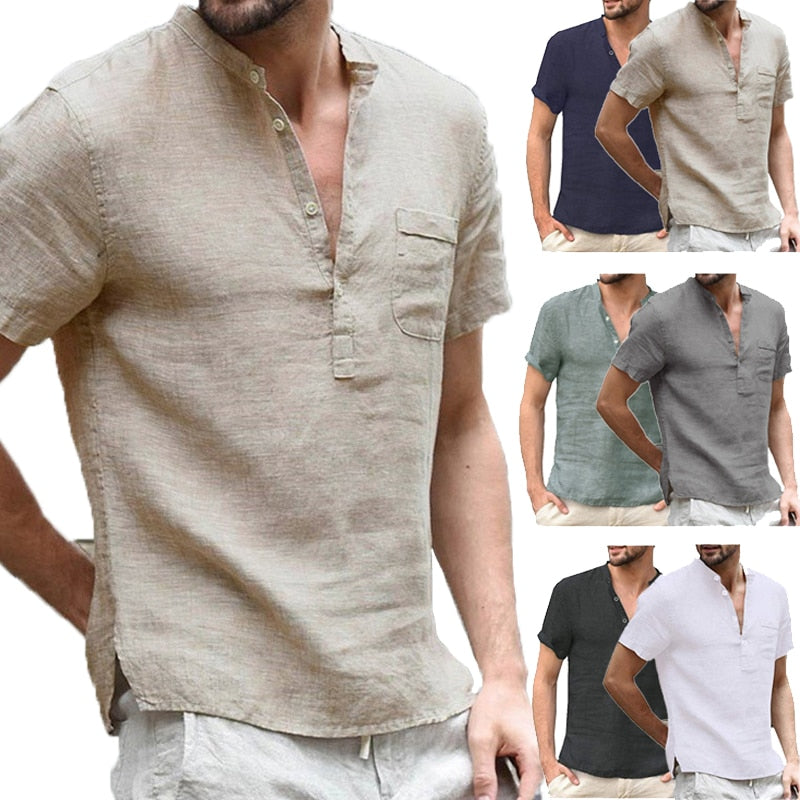 Summer New Fashion Cotton Linen Casual Shirts Male Short Sleeve Breathable Tops