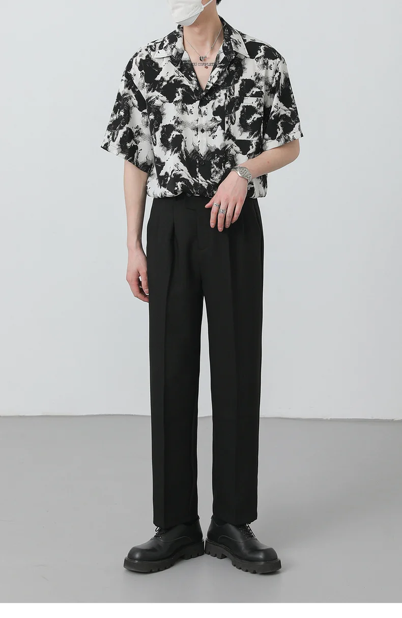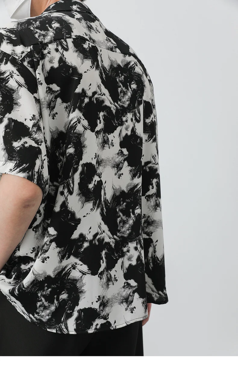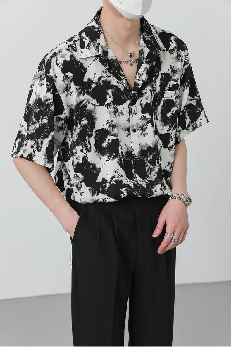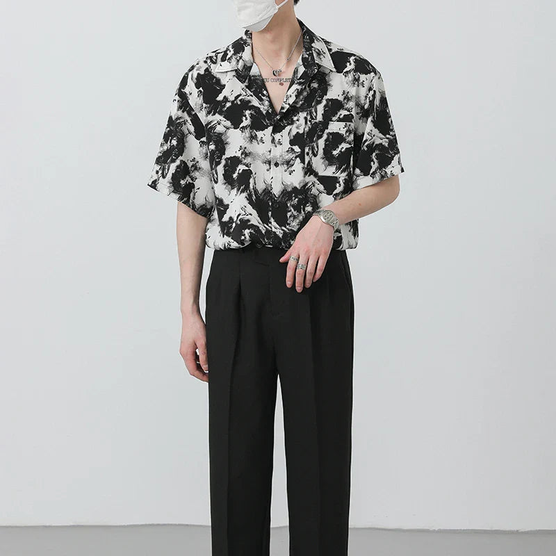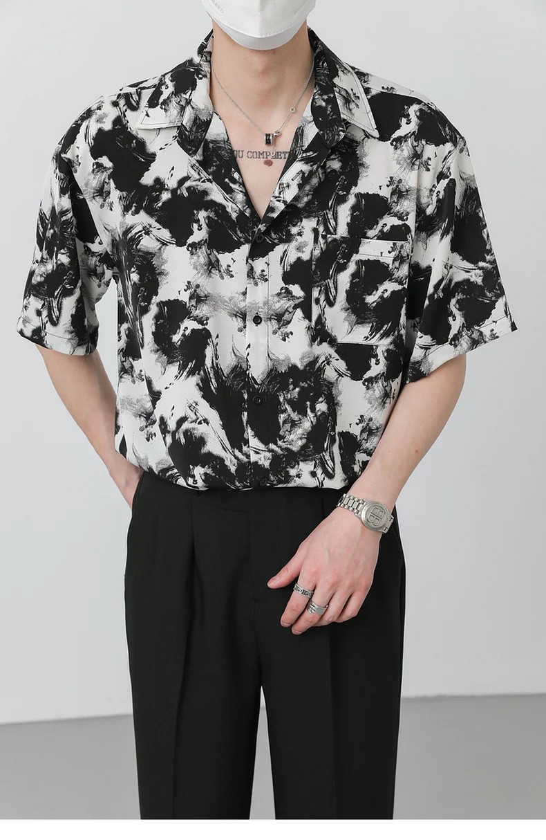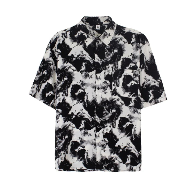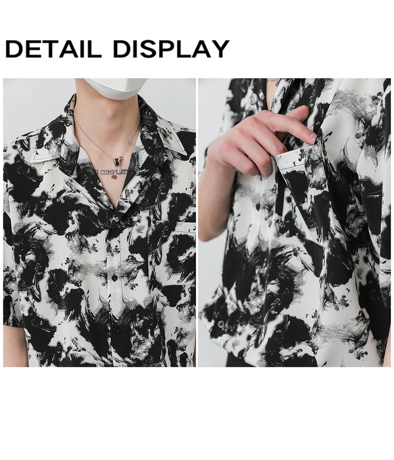 Summer Top Korean Loose High-grade Drape Ice Silk Shirt Men Short Sleeve Trendy Ink Print Non-ironing Hawaiian Shirts for Men