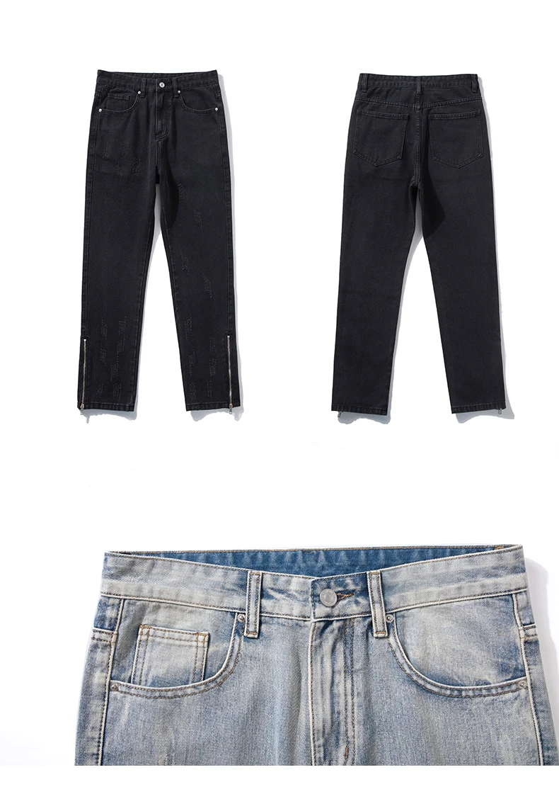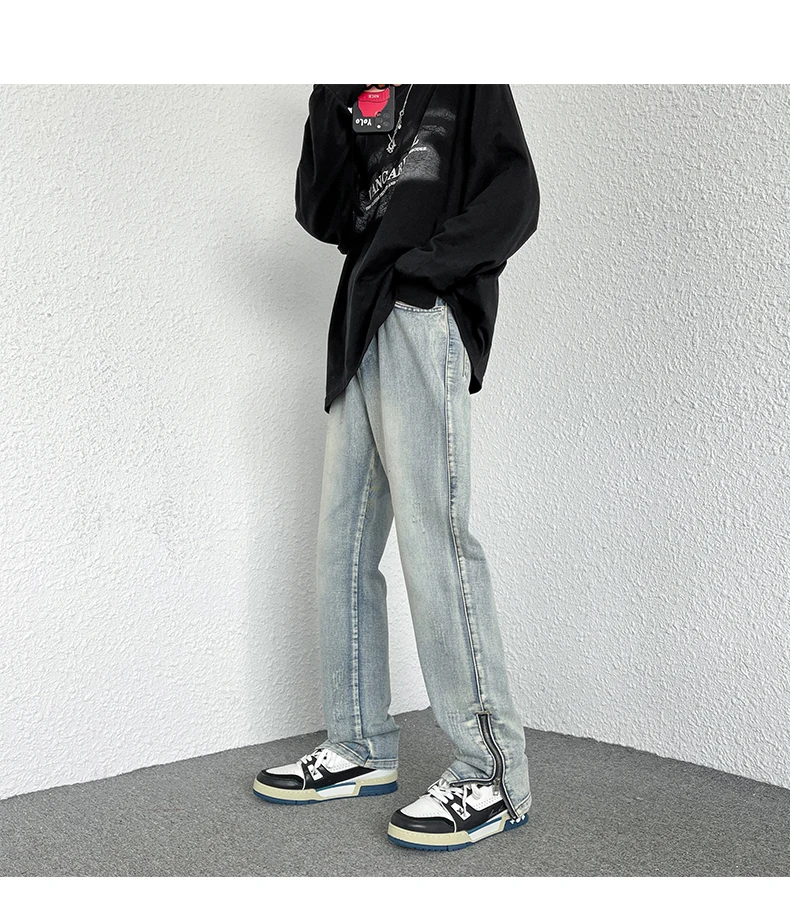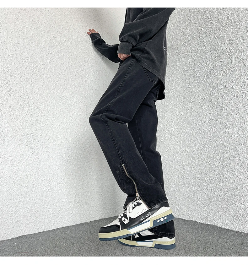 Threebooy 2024 Spring New Style Korean Style Men Fashionable Retro Street Jeans Zip Design on Trouser Legs Straight-leg Denim Pants Black