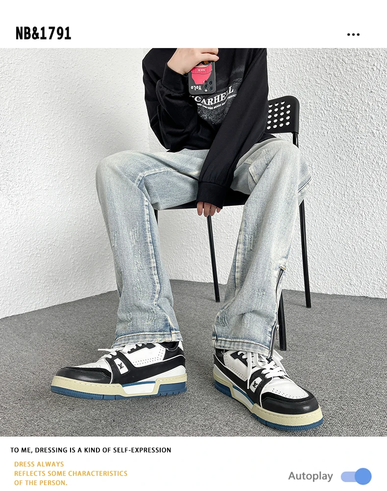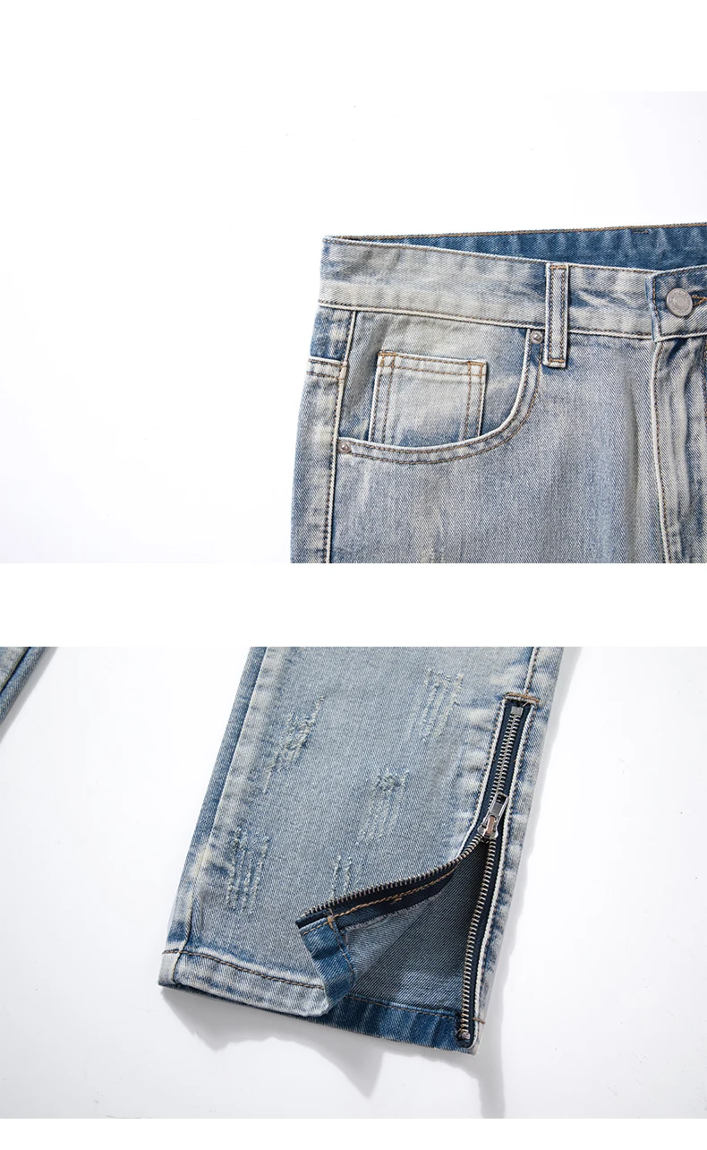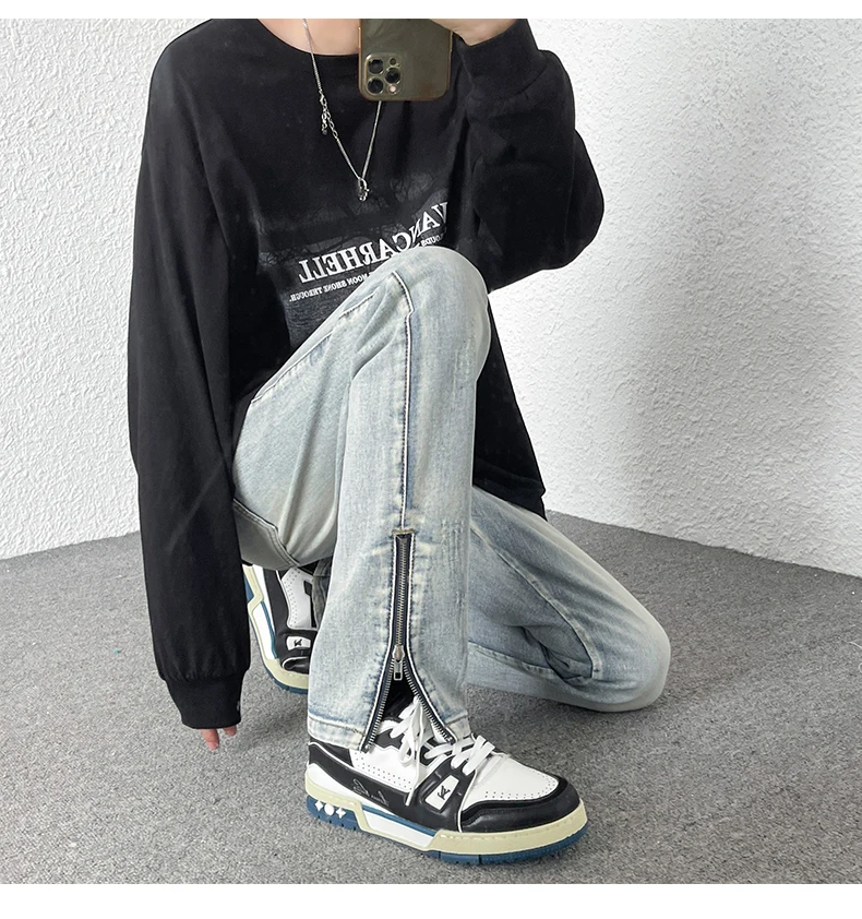 saferido 2024 Spring New Style Korean Style Men Fashionable Retro Street Jeans Zip Design on Trouser Legs Straight-leg Denim Pants Black