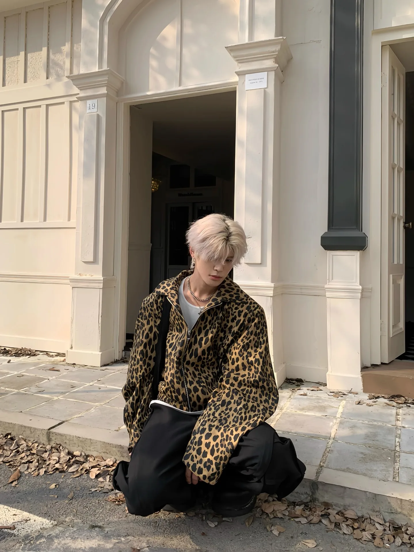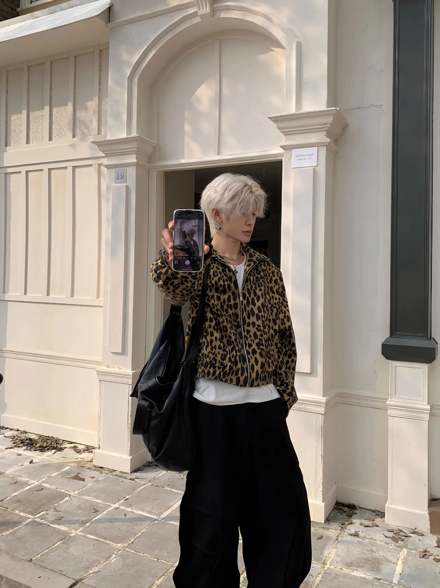 Threebooy 90s Streetwear Leopard Print Design with Curved Sleeves Short Jacket Men's Spring Autumn New Casual Jacket Top