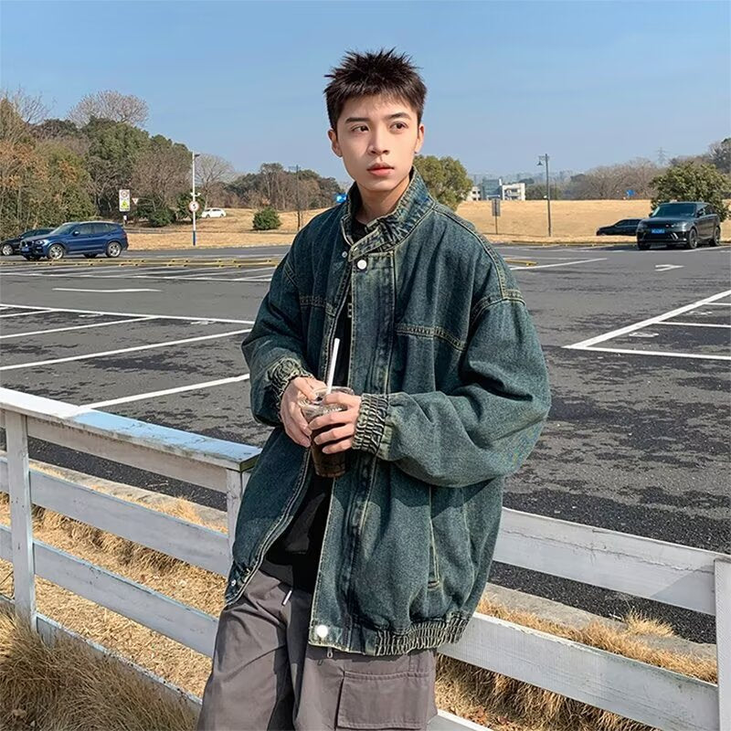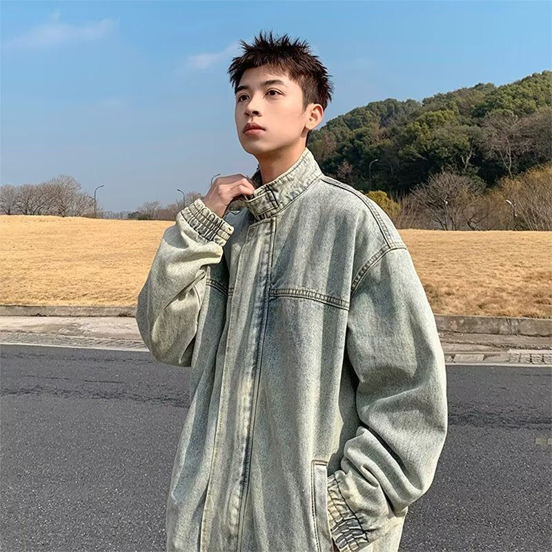 guys clothing styles Stand Collar Washed Denim Coat Men's American Style Ruffle Handsome Niche Loose Jacket Hong Kong Style Ins All-Matching Top