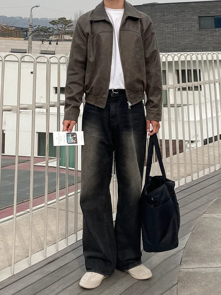 Threebooy Men PU Leather Jackets High Street Turn-down Collar Zipper Pockets Solid Color Male Short Coat 2024 Spring New Chic