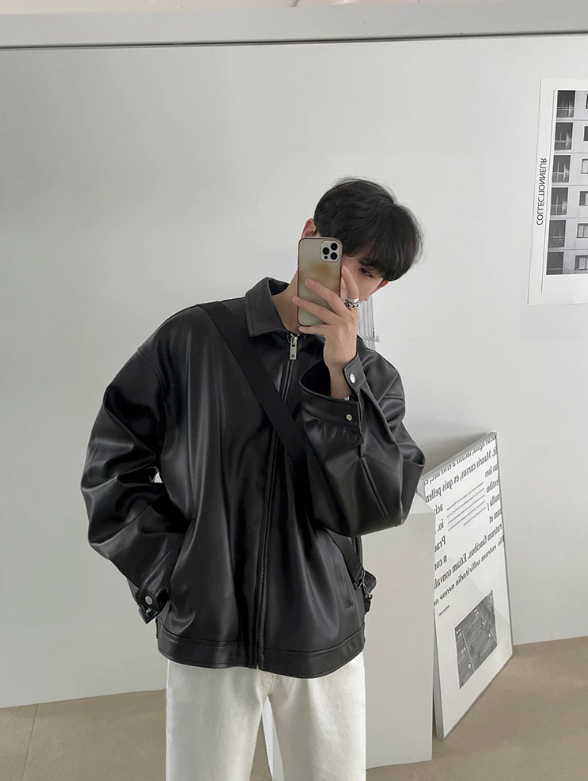 saferido Streetwear Trendy Loose-fit Leather Jacket Autumn Spring Japanese Style Casual Biker Jacket For Students Lapel Motorcycle Clothing