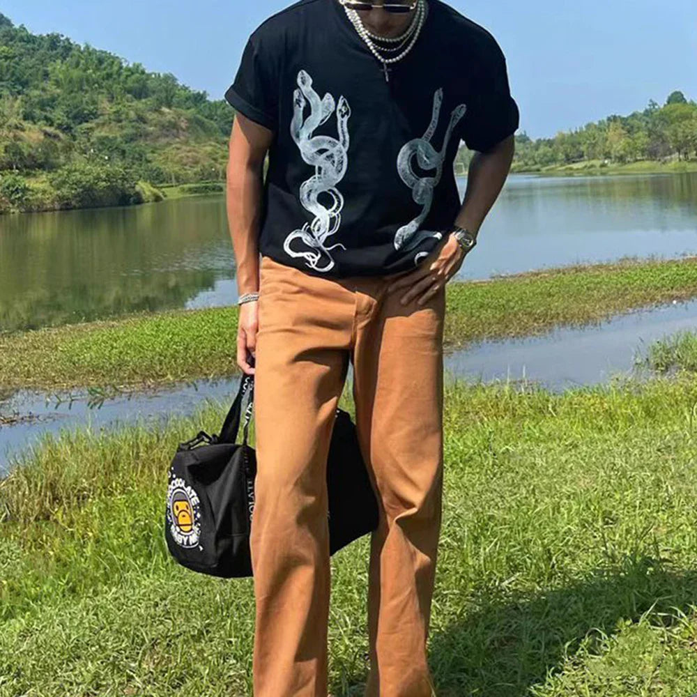 saferido Men's Casual T-Shirt Fashionable Trendy Hip-Hop High Street Y2k Retro Snake Pattern Loose Cotton Top 2024 Spring And Summer