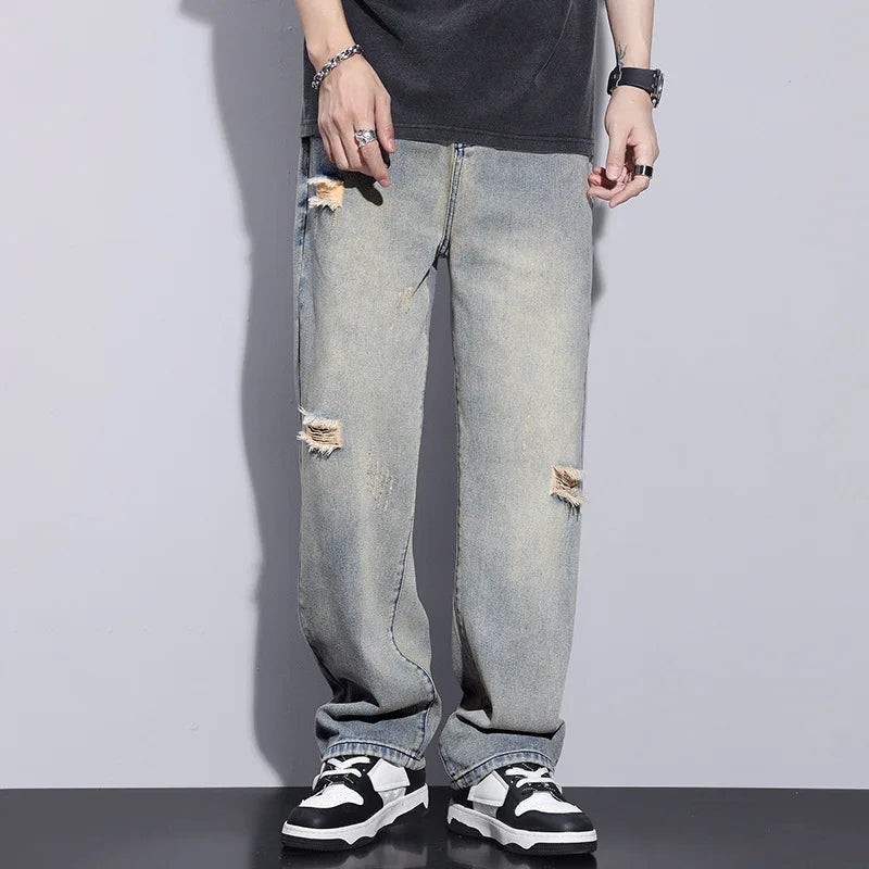 saferido Men's Clothing Y2k Baggy Jeans Spring/Summer New Man Pants American Trendy Hole Loose Leisure Straight Leg Wide Jeans for Men