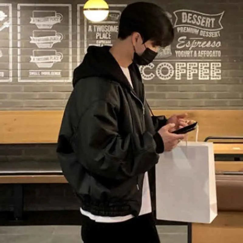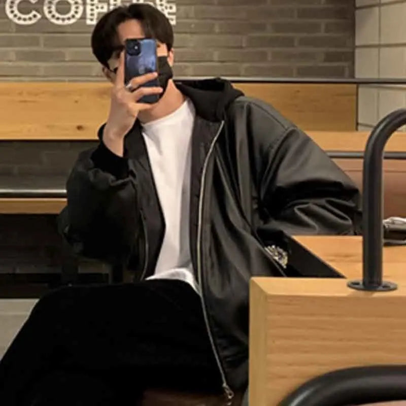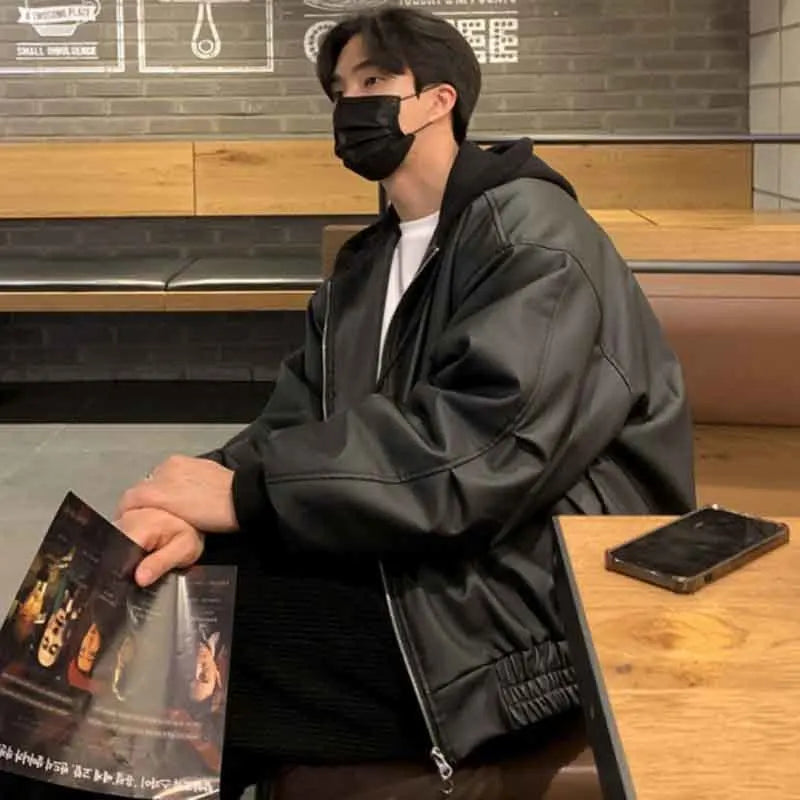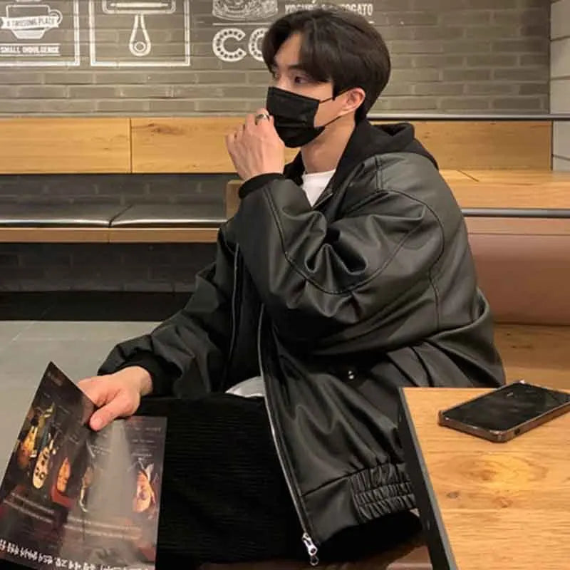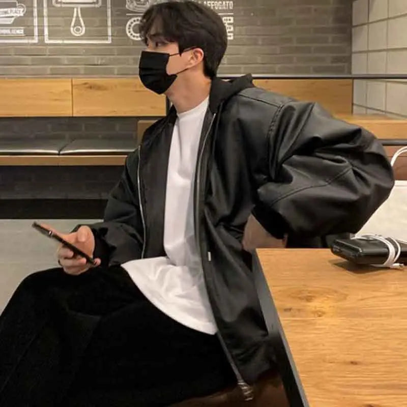 saferido Men's Hooded PU Leather Jackets High Street Patchwork Solid Color Double Zipper Baggy Male Short Coats Spring New