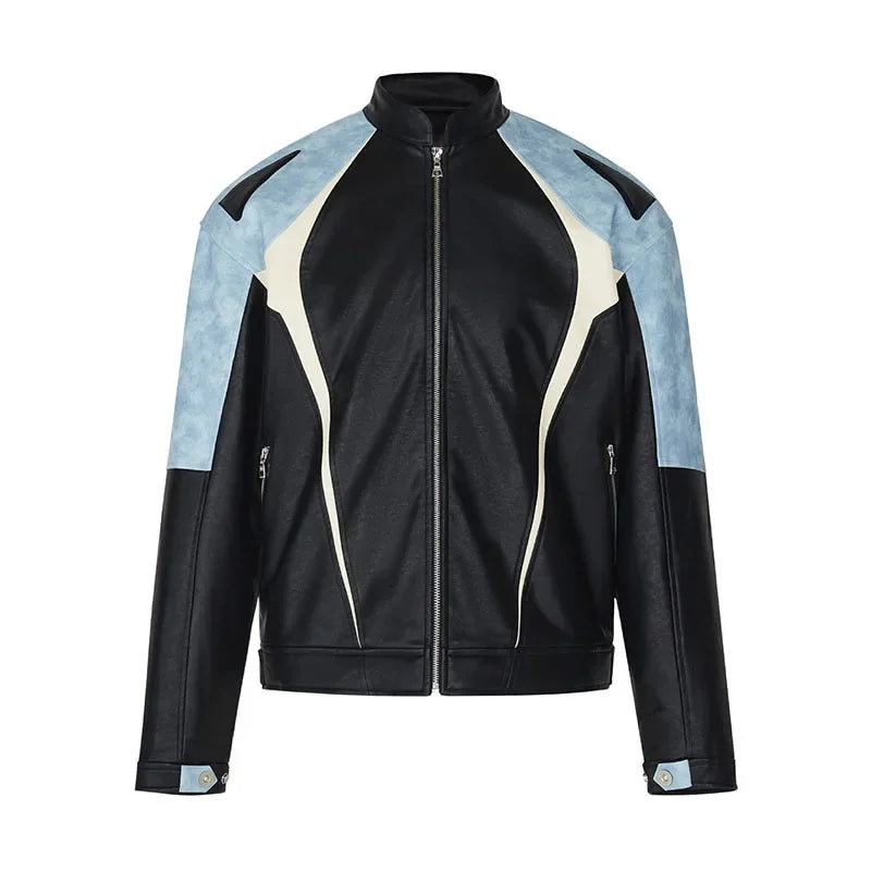 saferido Men's Motorcycle Leather Jacket Color Block Racing PU Leather Coat Women Spring New Zip Up Stand Collar Hip Hop Street Outwear
