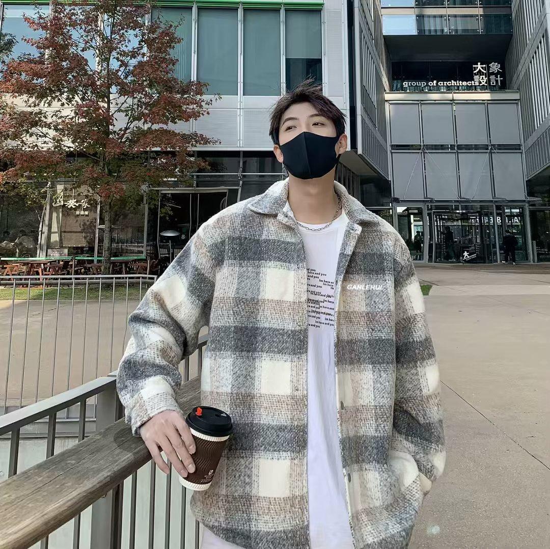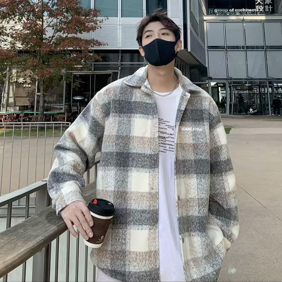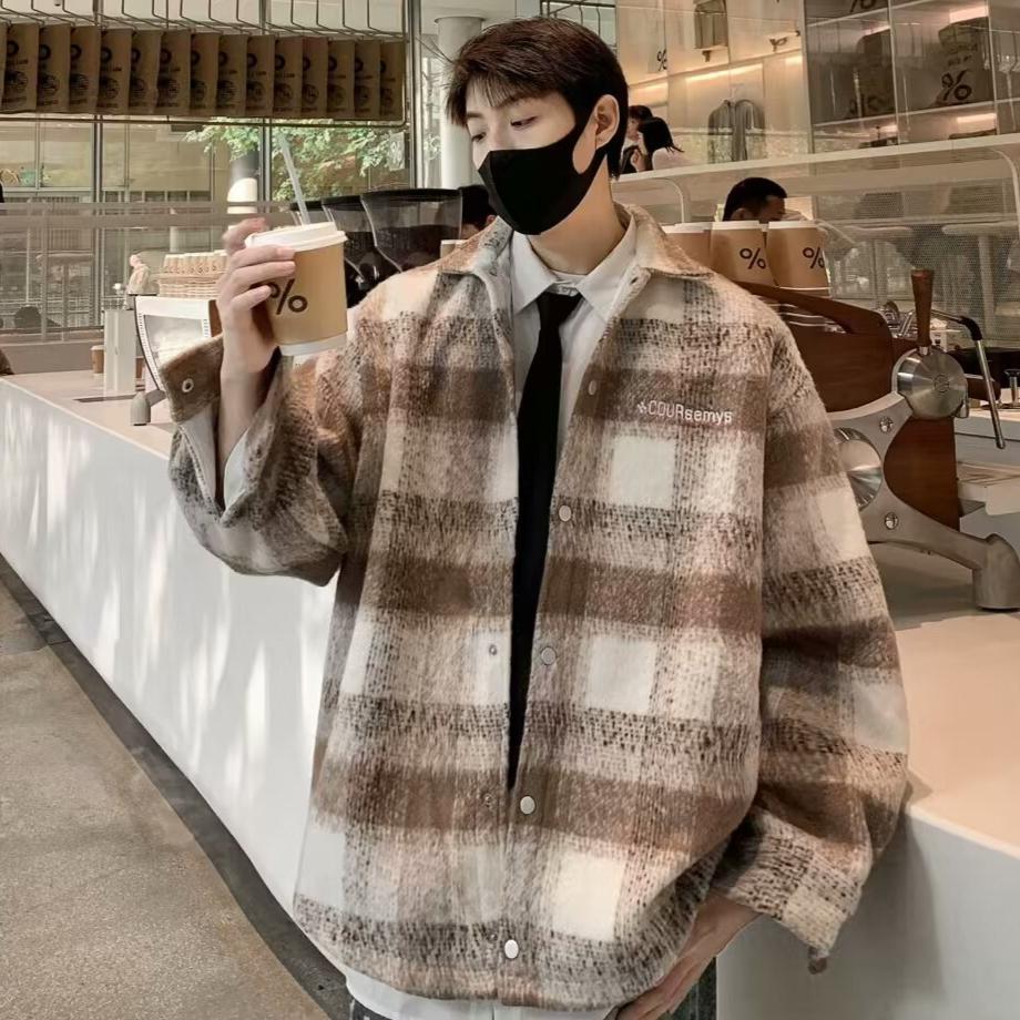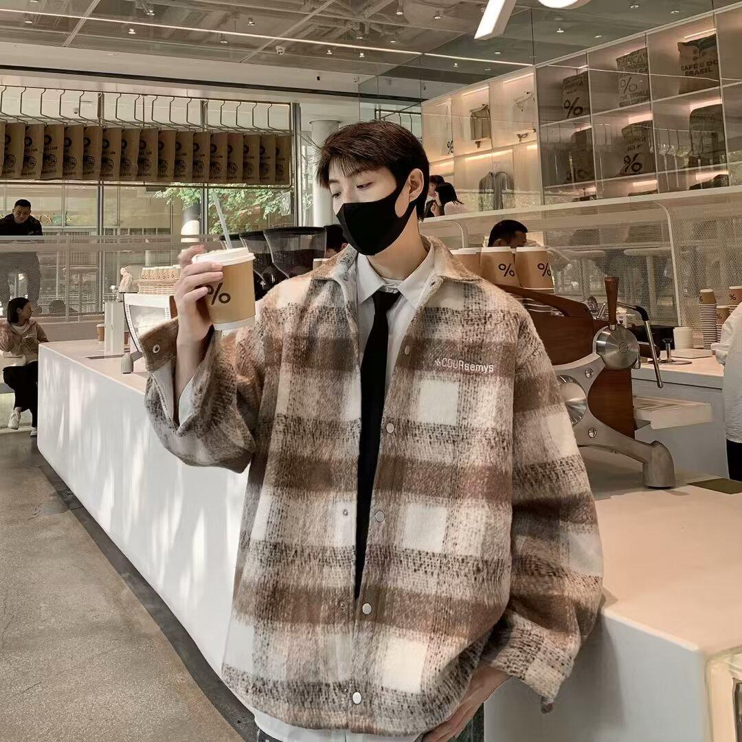 mens outfits 2024 Autumn and Winter New American Retro Contrast Color Plaid Cardigan Coat Men's Lazy Casual Loose Woolen Top