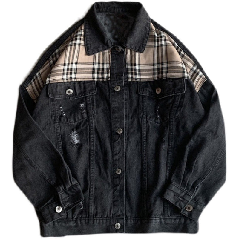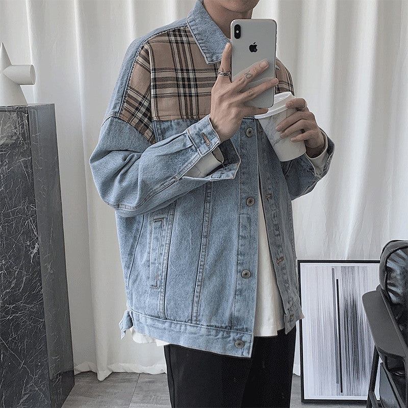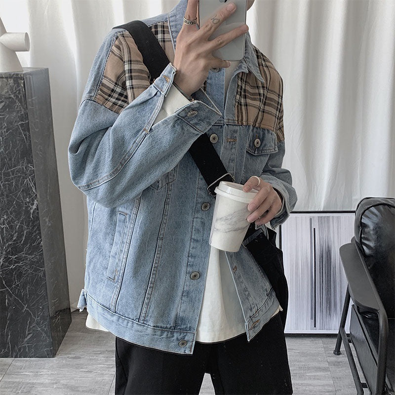 mens outfits Denim Jacket Men's Ins Spring and Autumn Hong Kong Style Korean Style Plaid Stitching Loose Casual Jacket Student Top