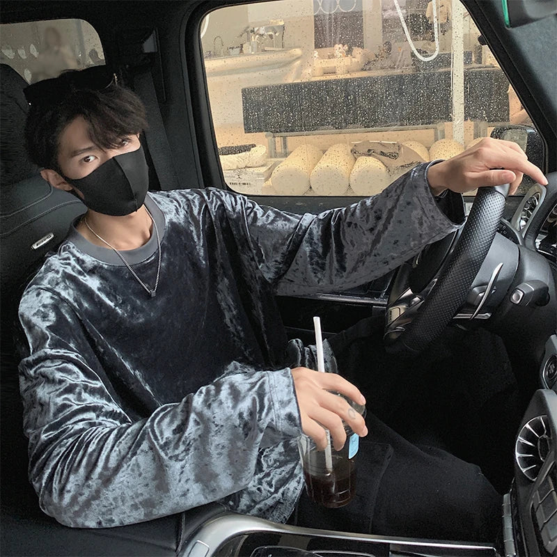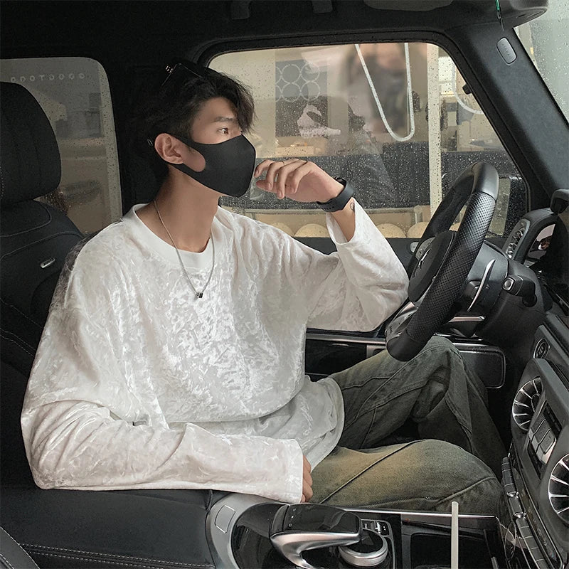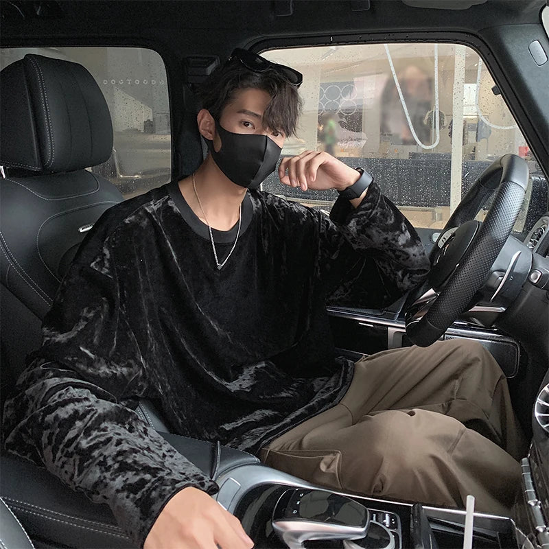 saferido Mercerized Velvet T Shirt Spring Autumn Simple Long Sleeve Tops Men's T-shirt O-neck Solid Tshirts T Shirt Men Tees Black/White