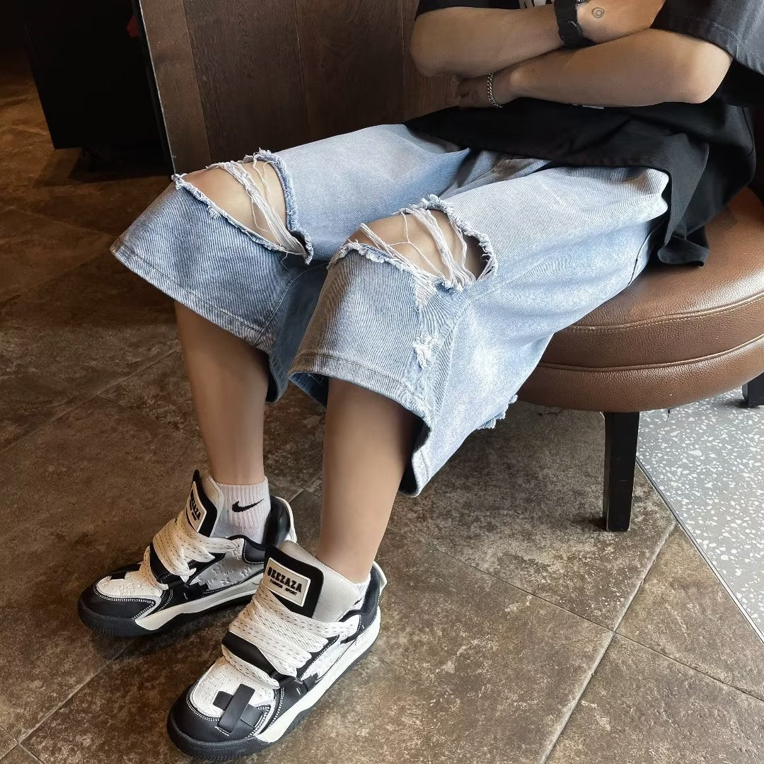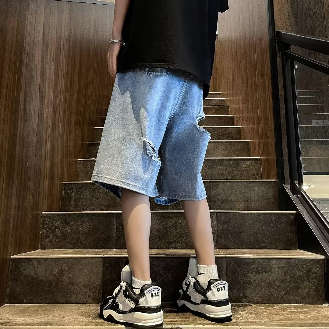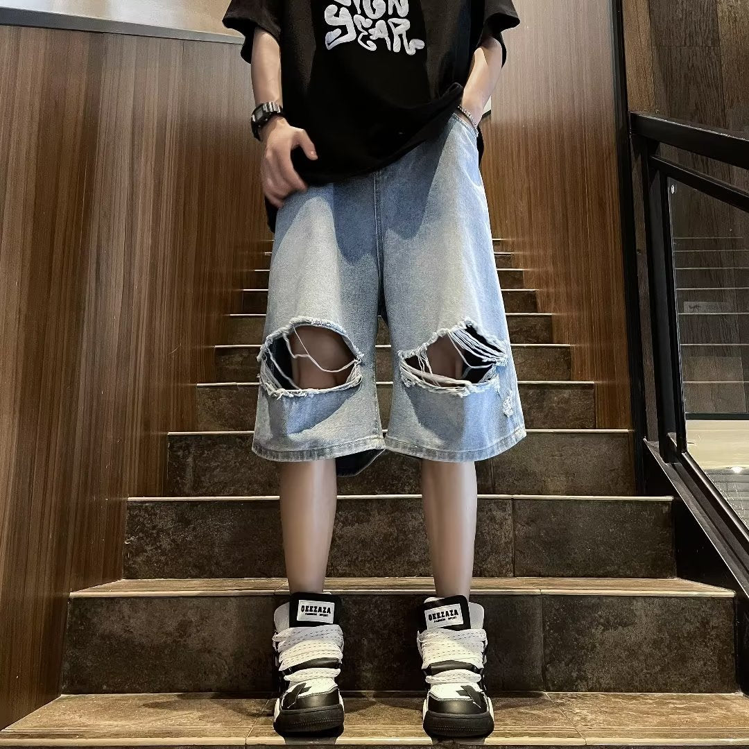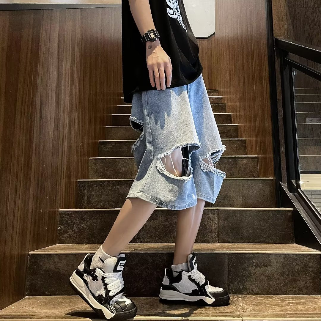 skater boy outfits Summer Fashion Brand Thin Knee Ripped Jeans Men's American-Style Loose Straight Wide-Leg Pants Trendy Shorts