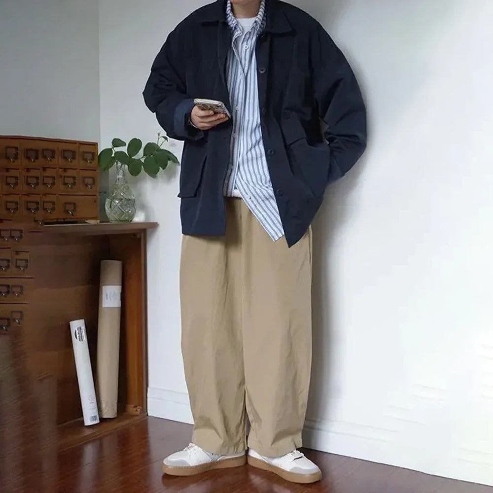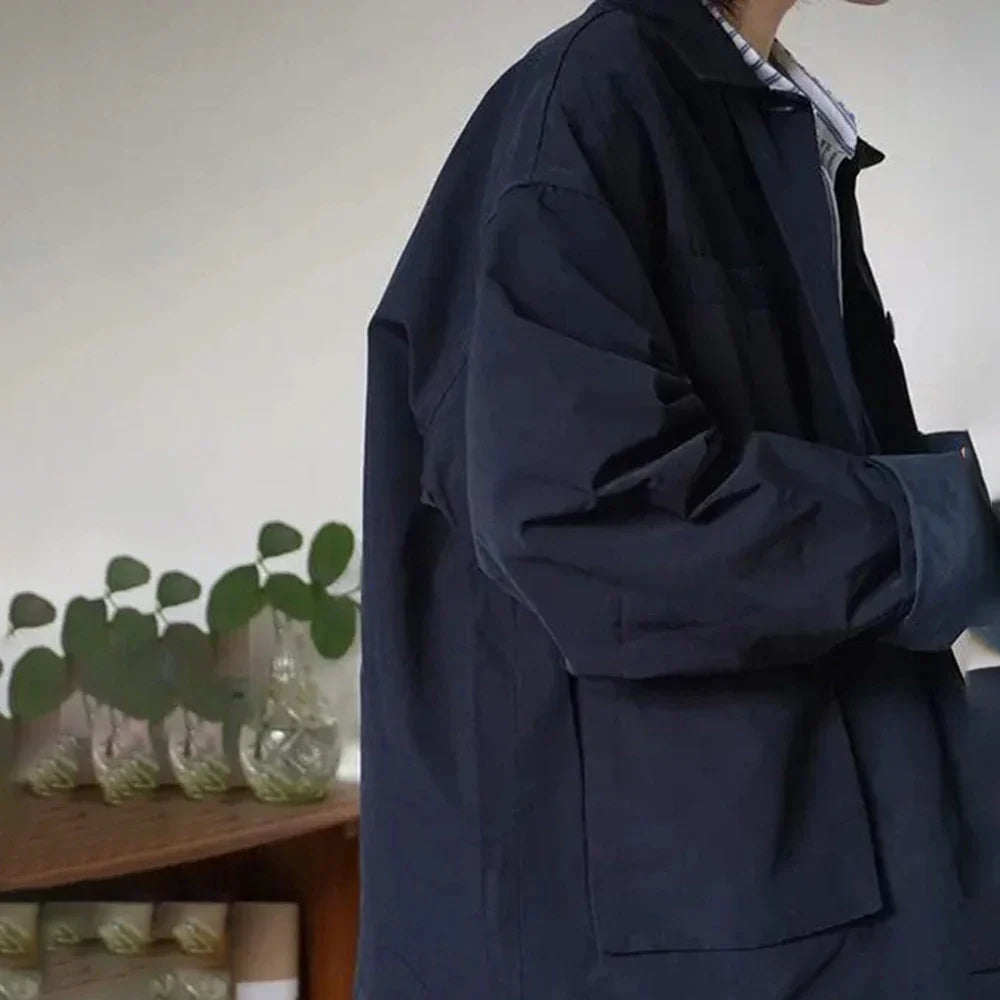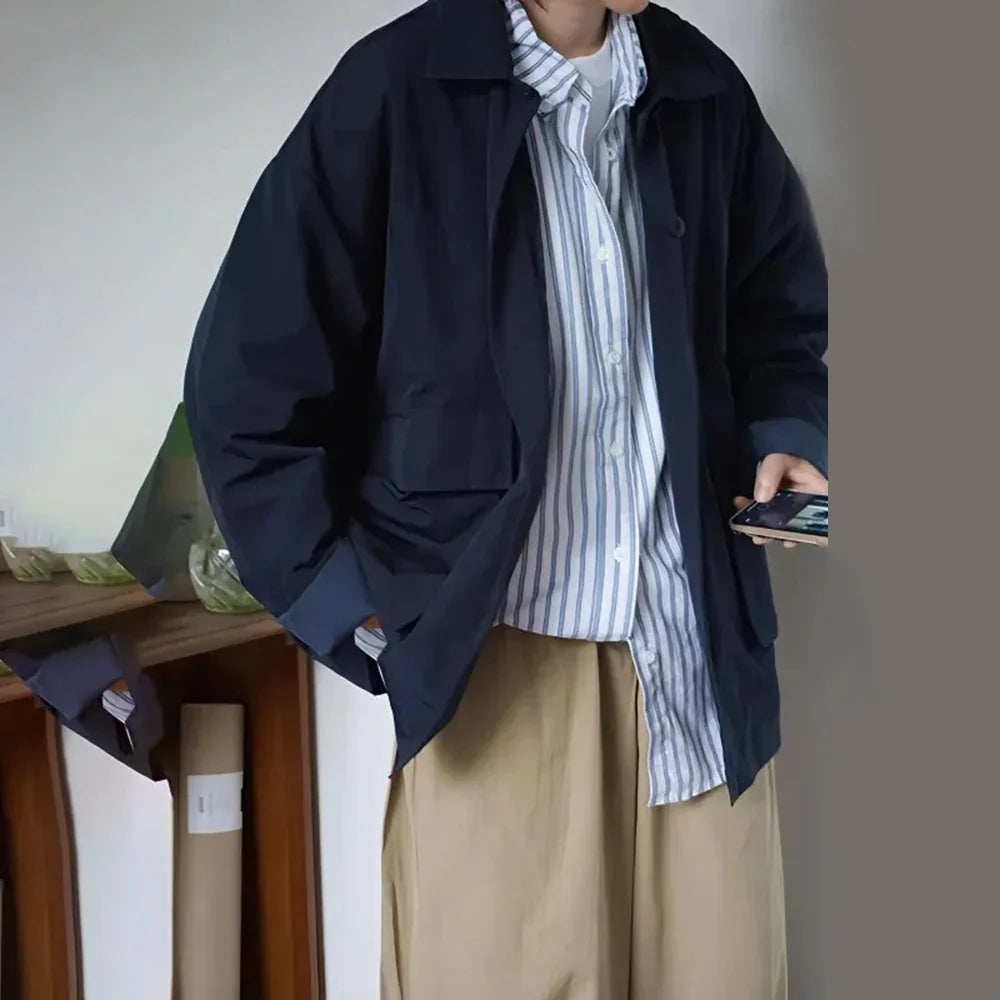 Threebooy Spring And Autumn Fashion Casual Loose Retro Jacket Unisex Solid Color Lapel Basic Versatile Functional Jacket Coat For Men