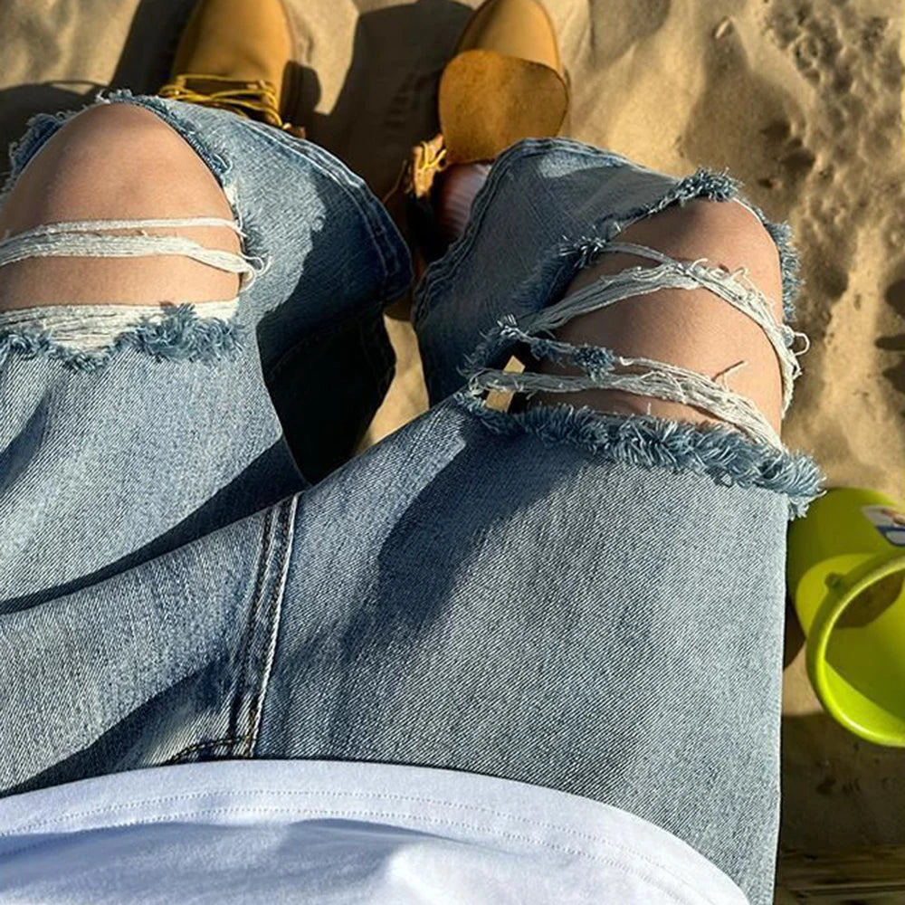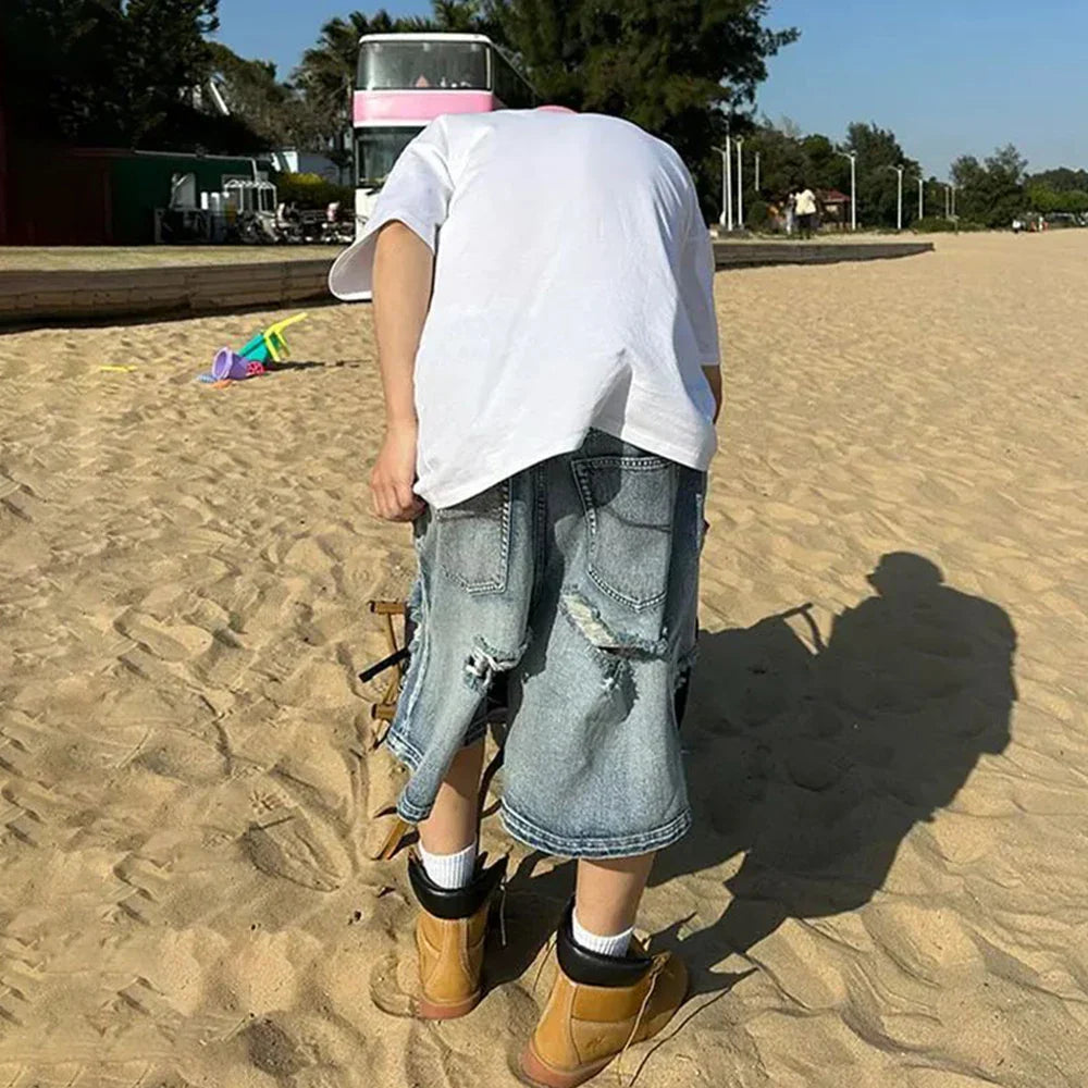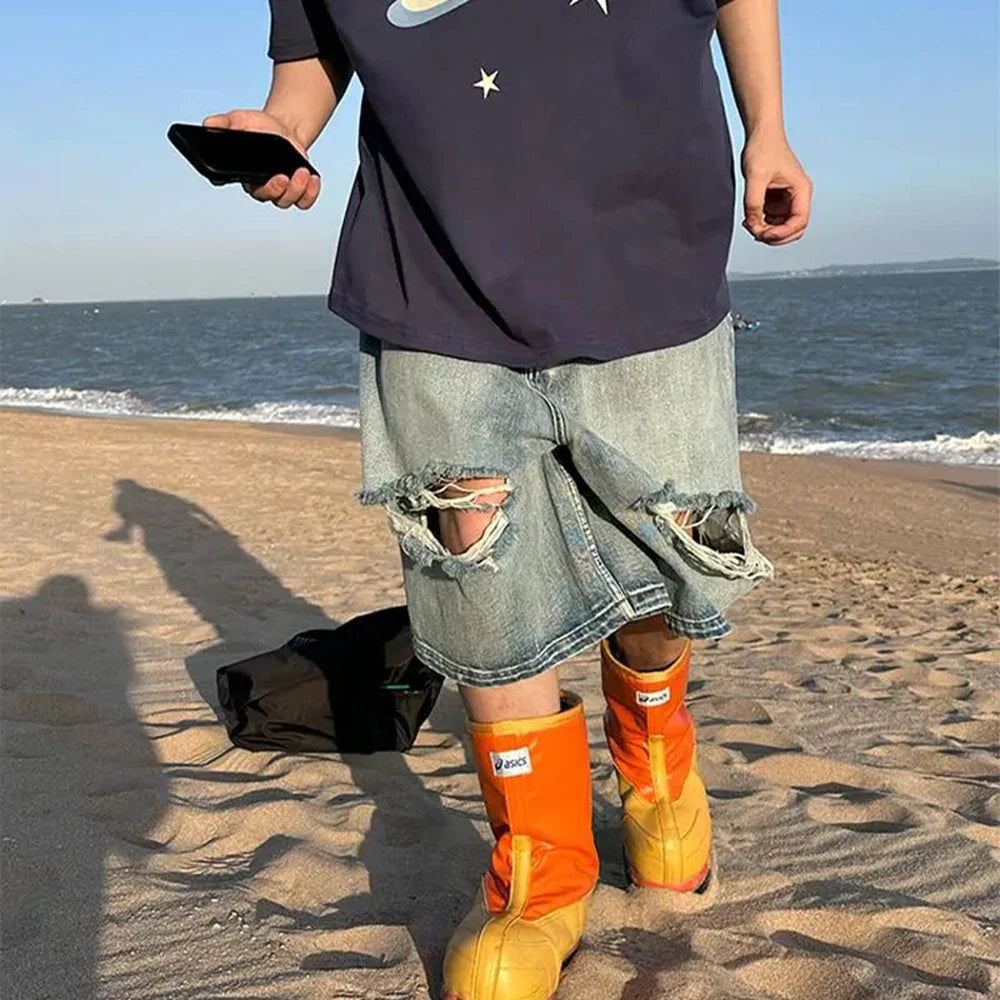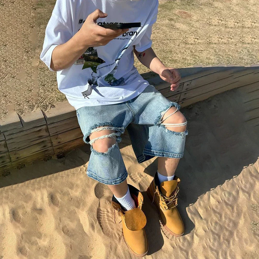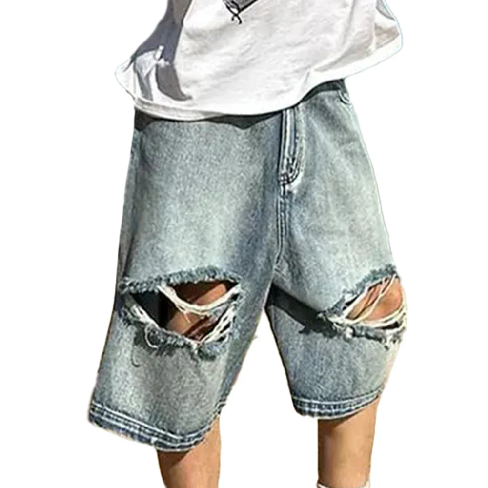 Threebooy Spring Summer Fashion Trend Thin Wide-Leg Loose Mid-Pant Shorts American Street Hip-Hop Ripped Distressed Y2k Jeans For Men