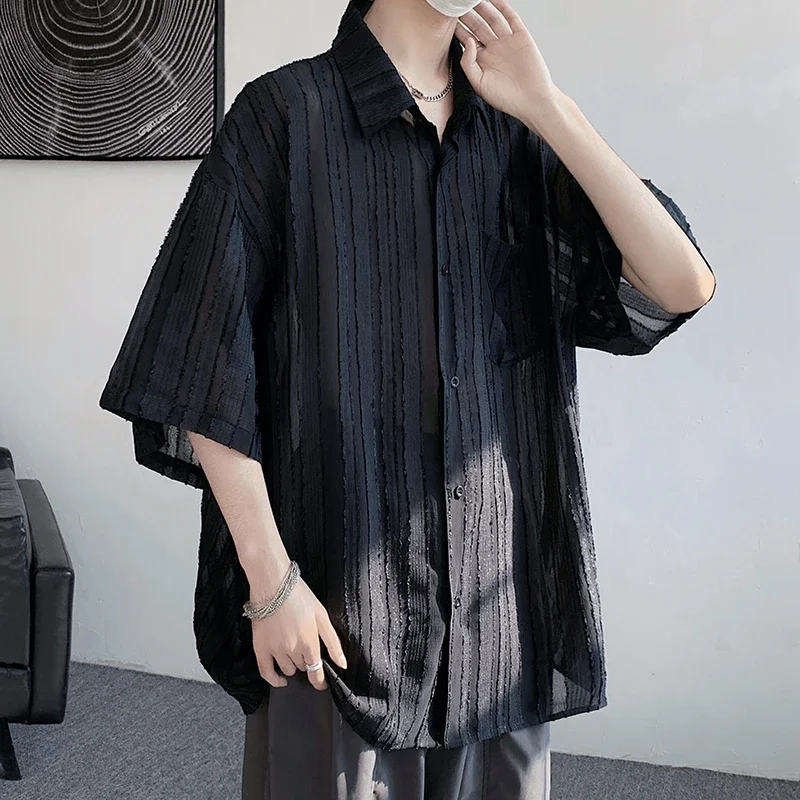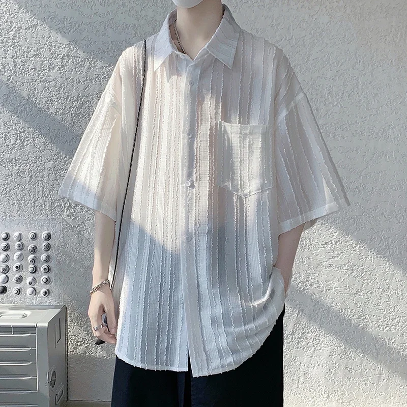 saferido Spring Summer Men's Solid Shirts Short Sleeve Harajuku Style Cardigan Casual Blouses Male Plus Size Lapel Shirt