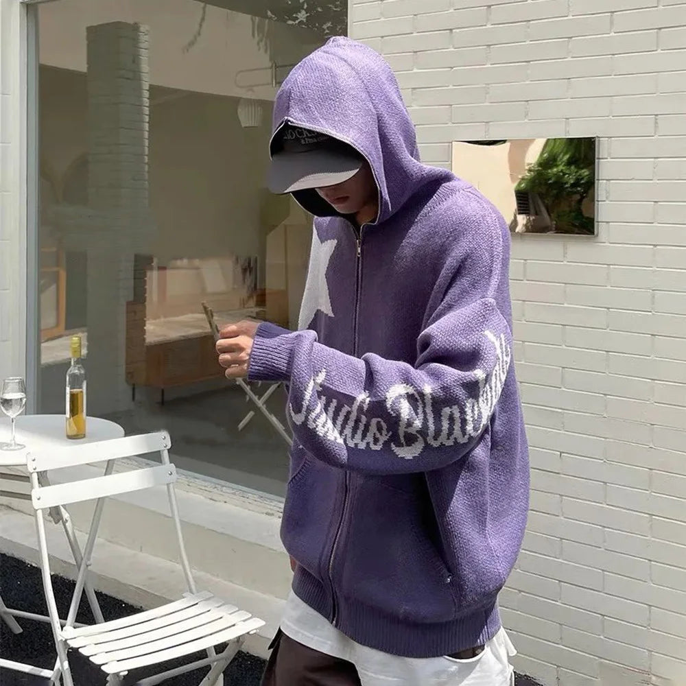 Threebooy Star Zipper Cardigan Men Hooded Knitted Sweater Y2K Streetwear Spring Fall American Loose Casual All-match Hooded Sweater Jacket