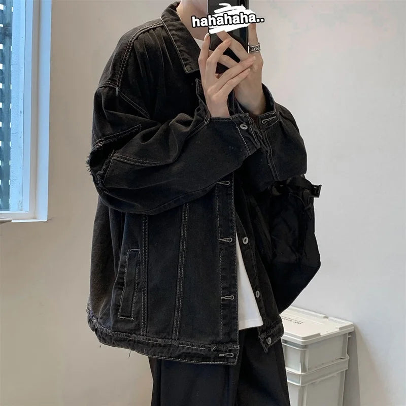Threebooy Summer hole blasting Street coat senior men's spring and autumn ruffian jeans handsome trend coat work clothes cowboy bomber jacket