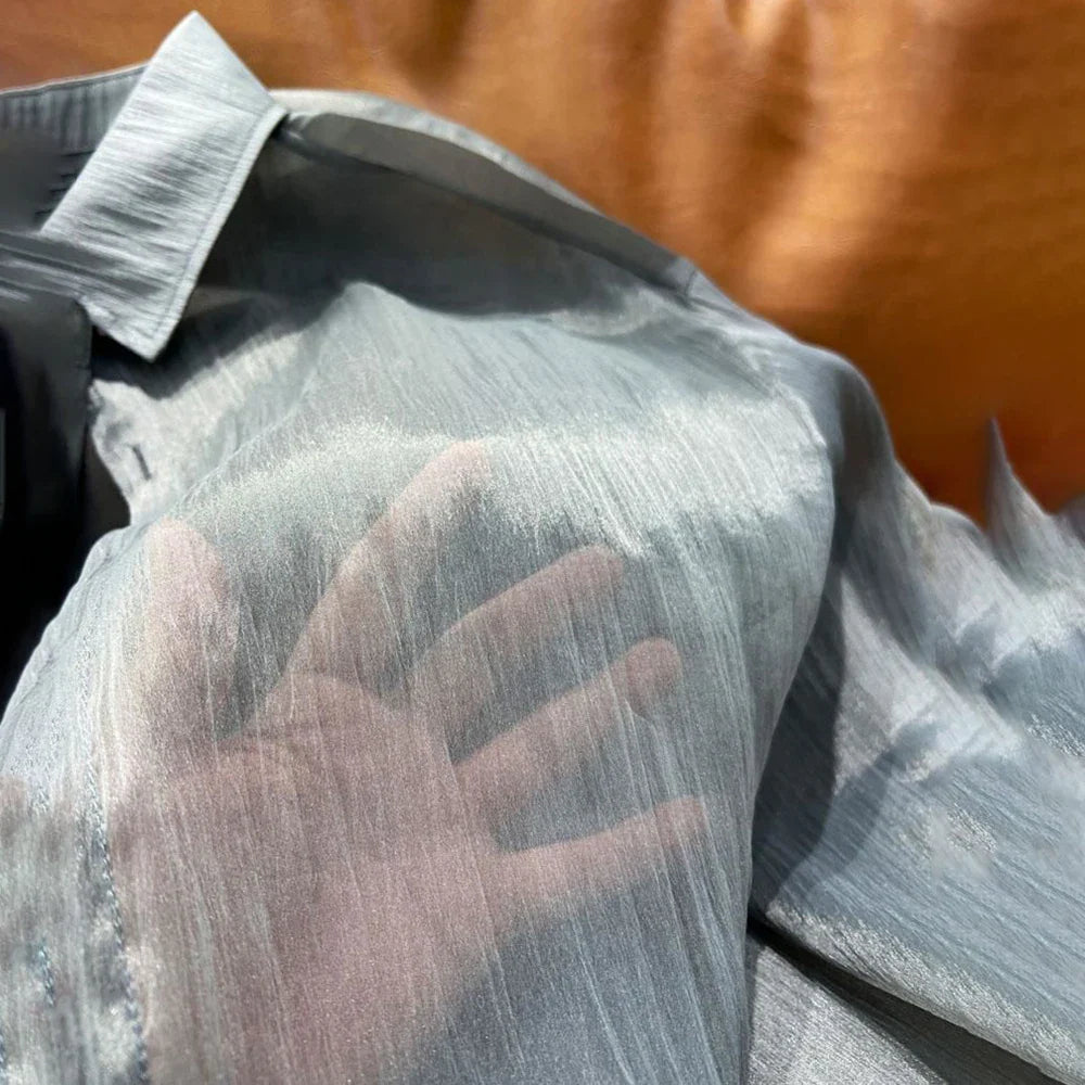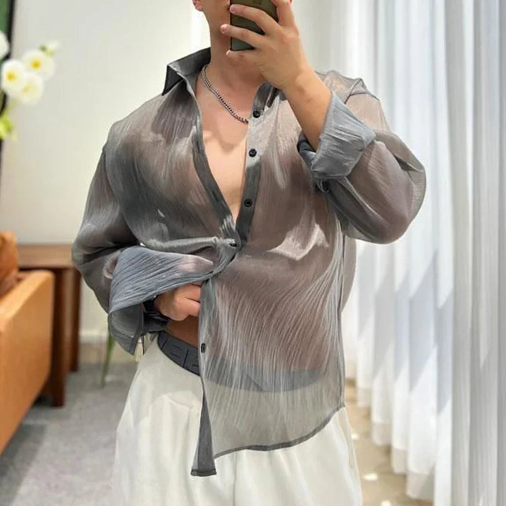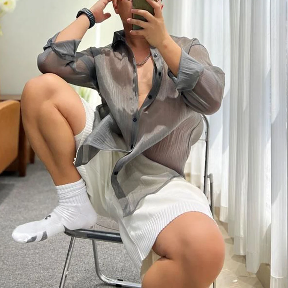 saferido Trendy Fashion Shirt Men's See-through Solid All-match Blouse Spring Summer New Sexy Mesh Long-sleeved Shirts LGBT Streetwear