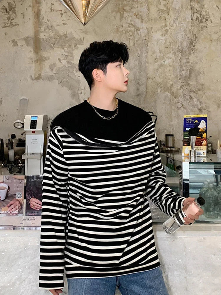 saferido Wide Streetwear Open Shoulder Zipper Fake Two Pieces Stripe Long Sleeve Top Men's Loose Long Sleeved T-shirt Spring