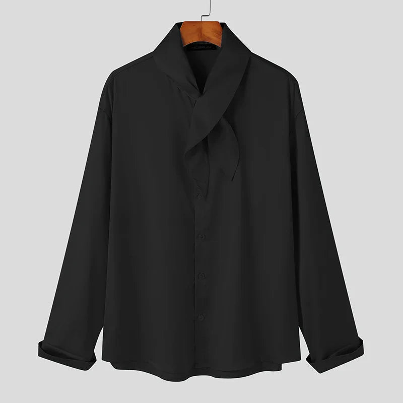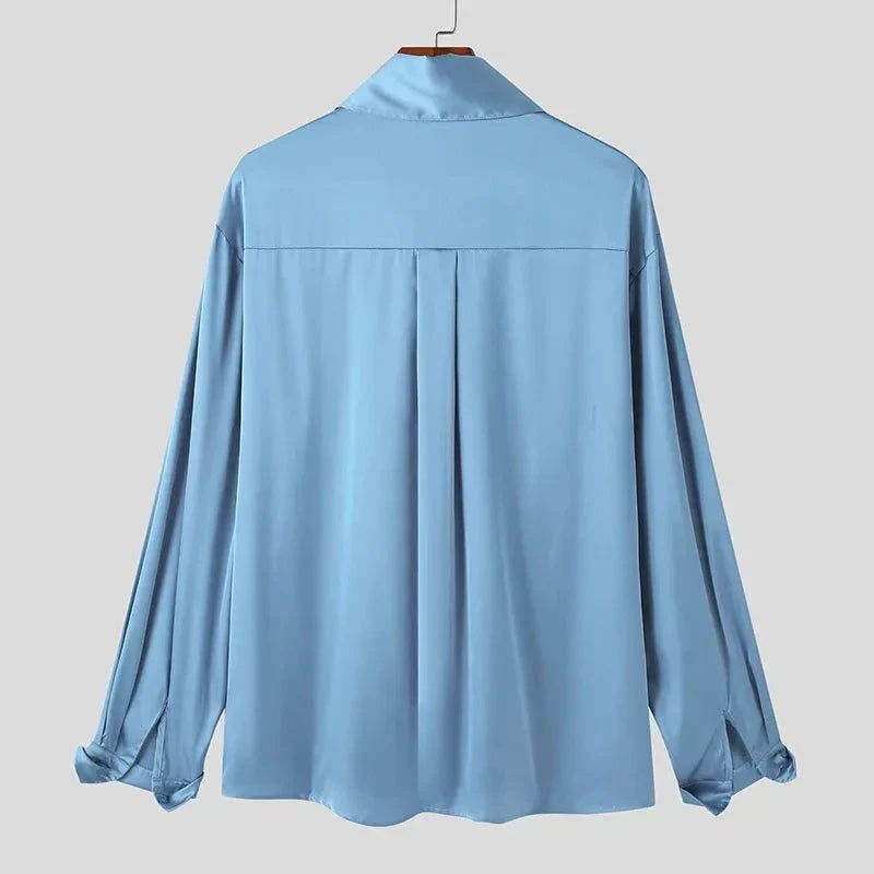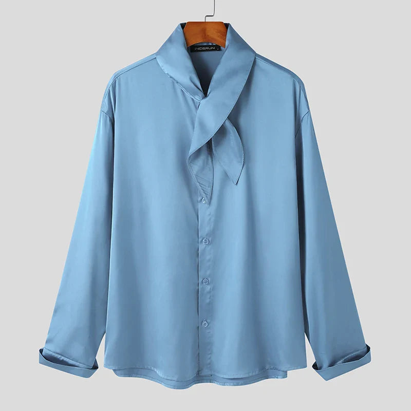 Tops Korean Style Mens Silk Drape Necktie Shirts Casual Well Fitting New Men's Solid All-match Sleeved Blouse S-5XL