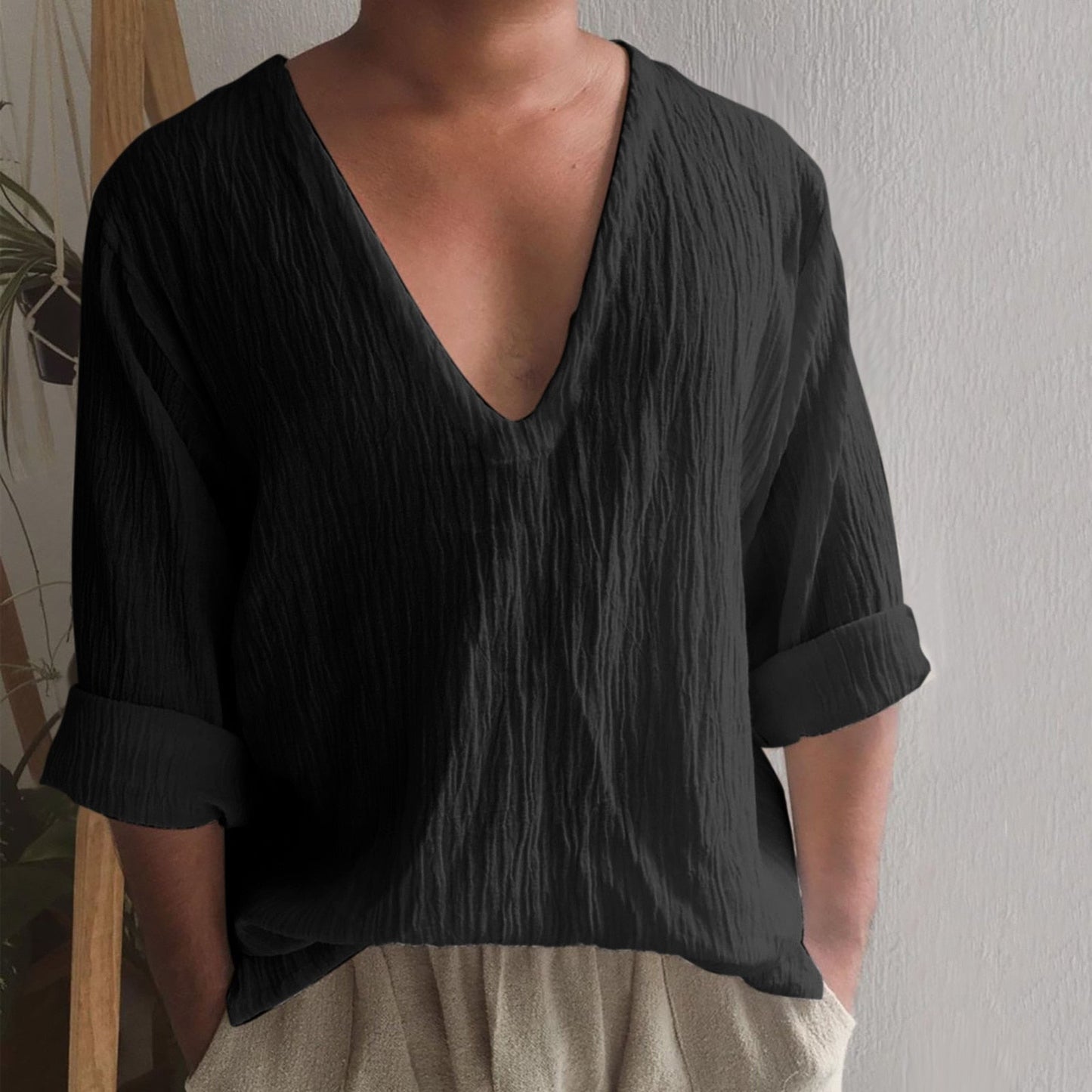 Vintage Imitation Linen Shirt Men Breathable Casual Long Sleeve Oversize Tops Summer V Neck Boho Style Mens Shirts 의류 Кофта