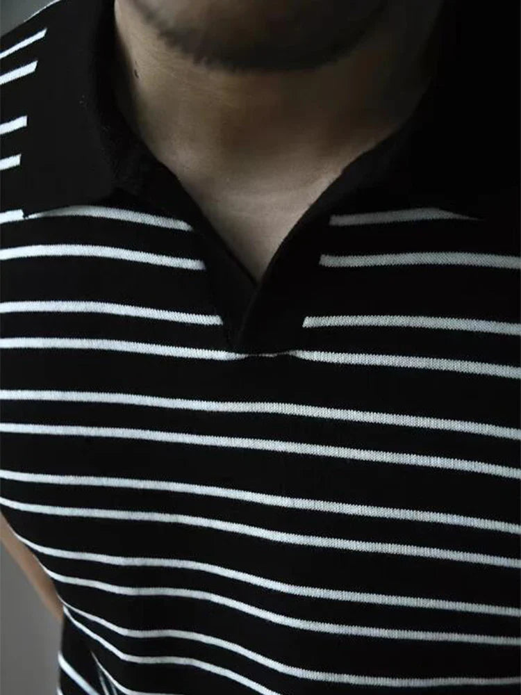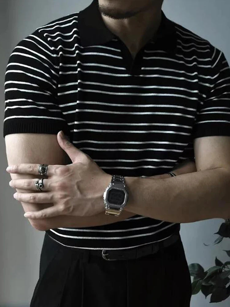 Vintage Striped Knit Polo Shirts Men Short Sleeve Casual Tops Spring Summer Mens Fashion Buttoned Turn-down Collar Slim T Shirt