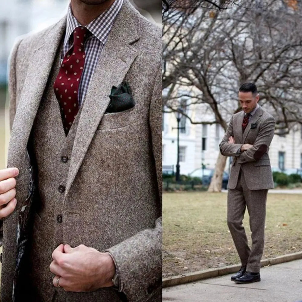 Vintage Winter Tweed Suits Brown Tweed Men Suits With Patch Design 3 Pieces Costume Homme Smart Business Formal Wedding Suits