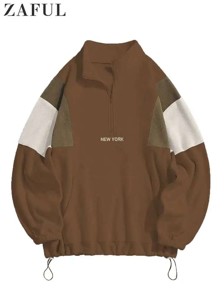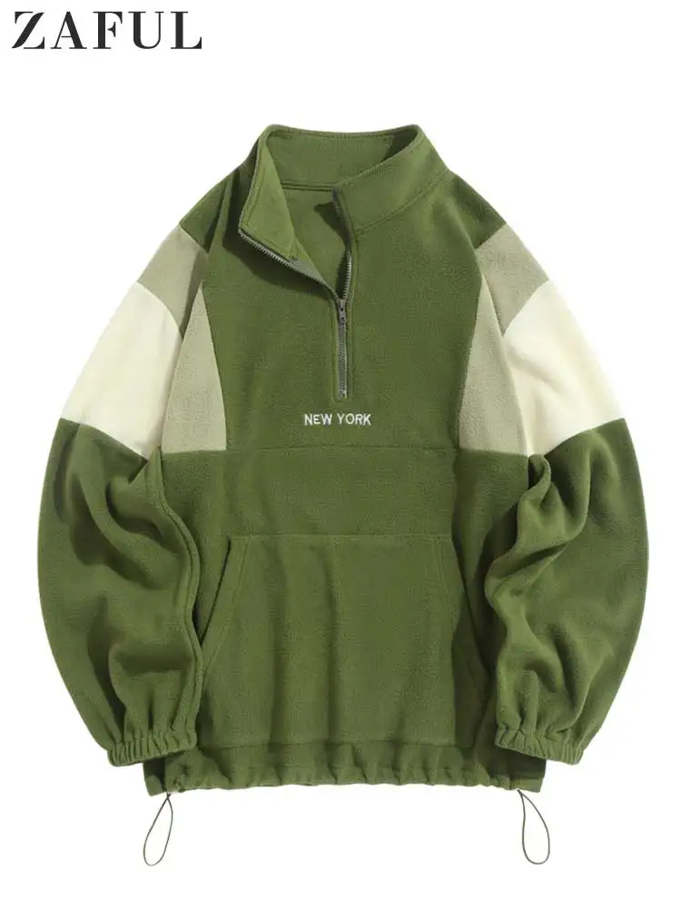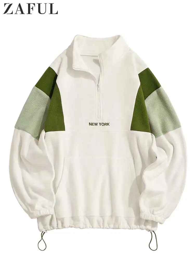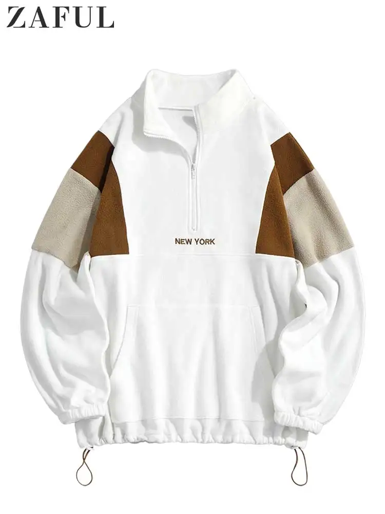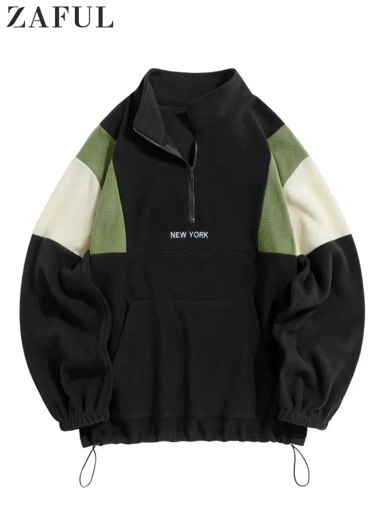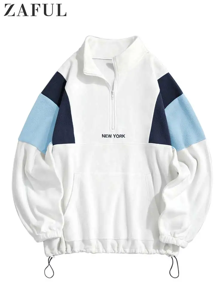 Hoodie for Men Fluffy Polar Fleece Sweatshirts New York Embroidery Turtleneck Hoodies Pullover Color Block Zipper Sweats